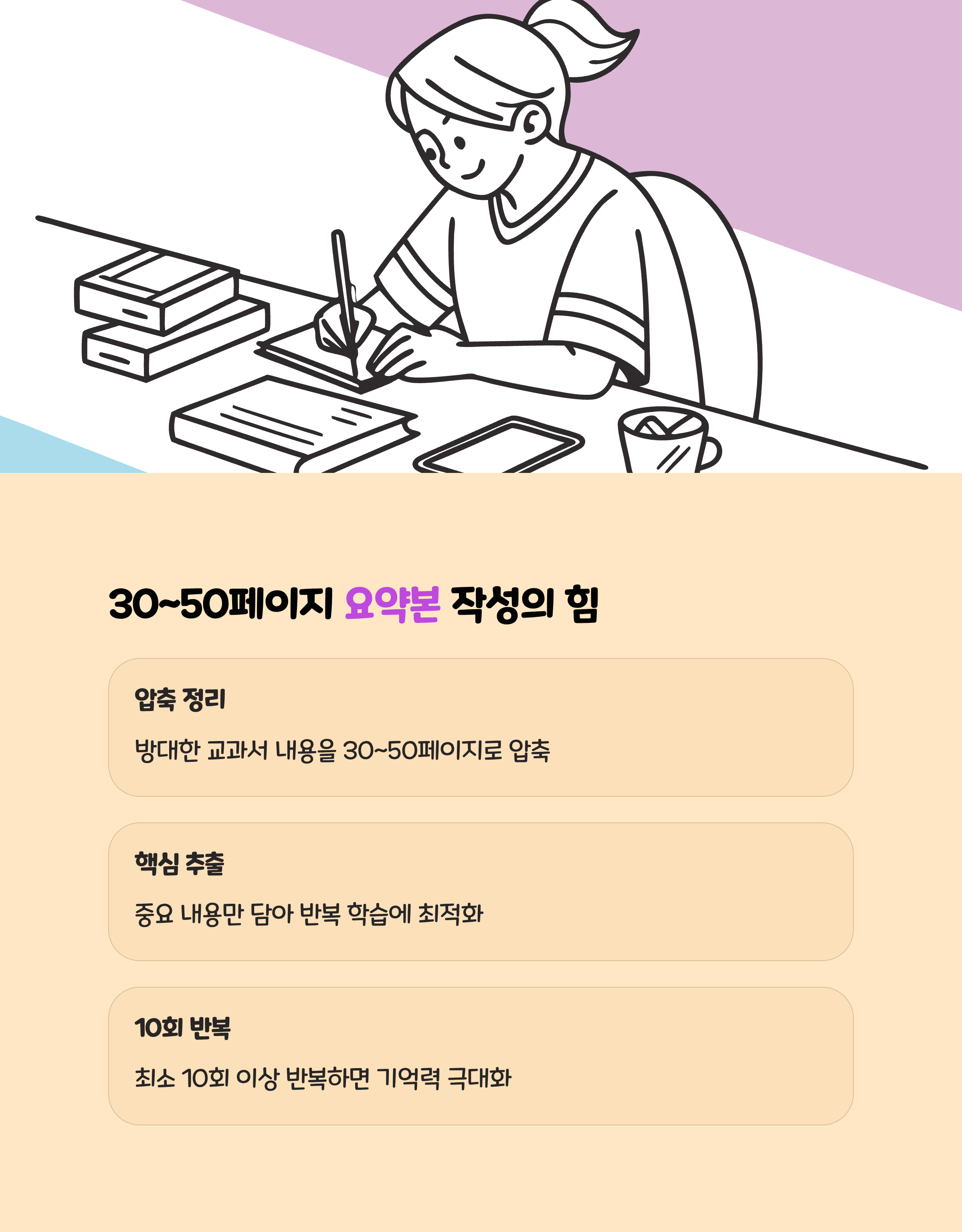 | 압축본 반복 회독 | 30-50페이지 요점본으로 10회 이상 반복 | 암기 효율 극대화 |