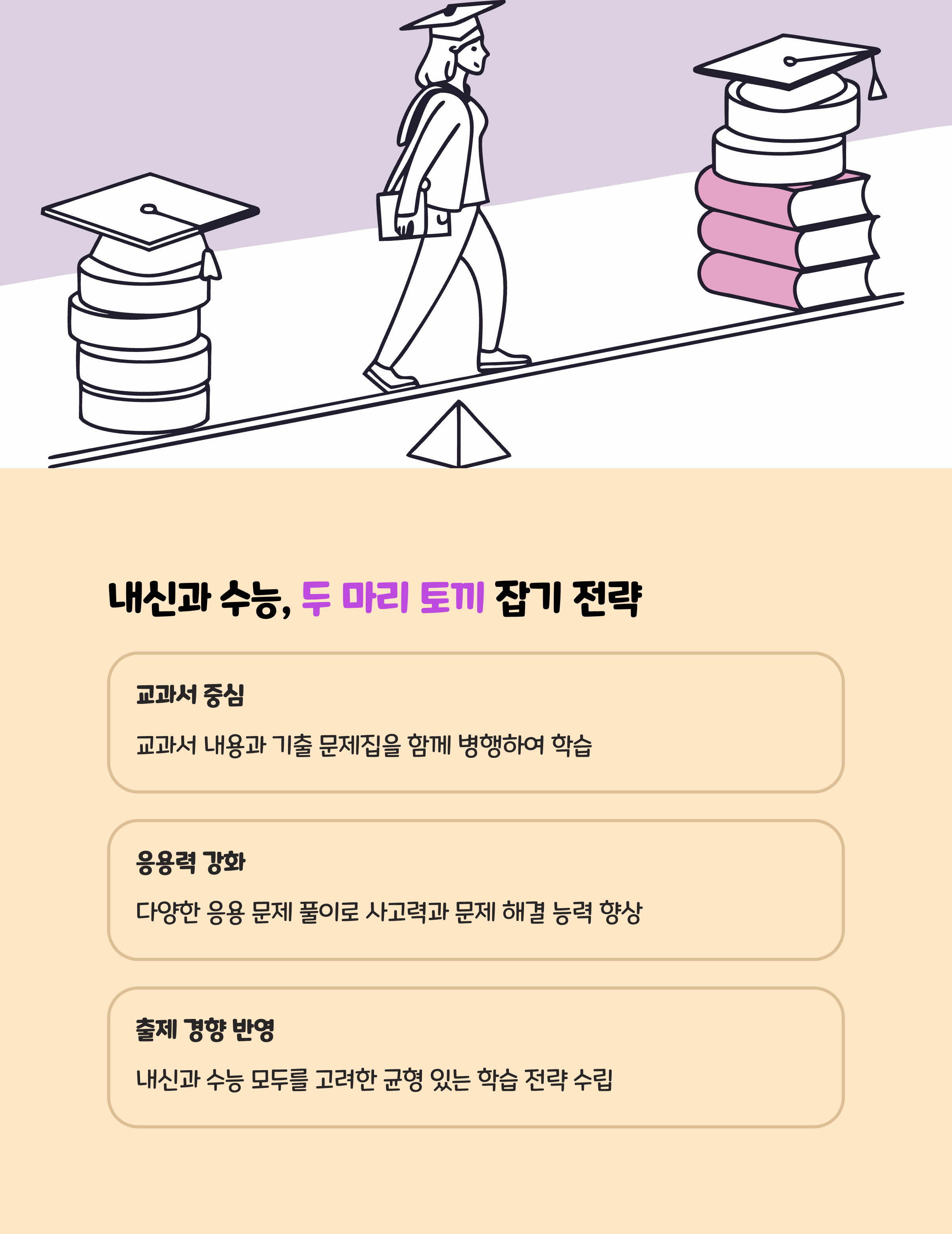 - 학습 시간 배분: 내신 대비와 수능 복습을 7:3 또는 6:4 비율로 조절해서 균형 있게 운영하세요.