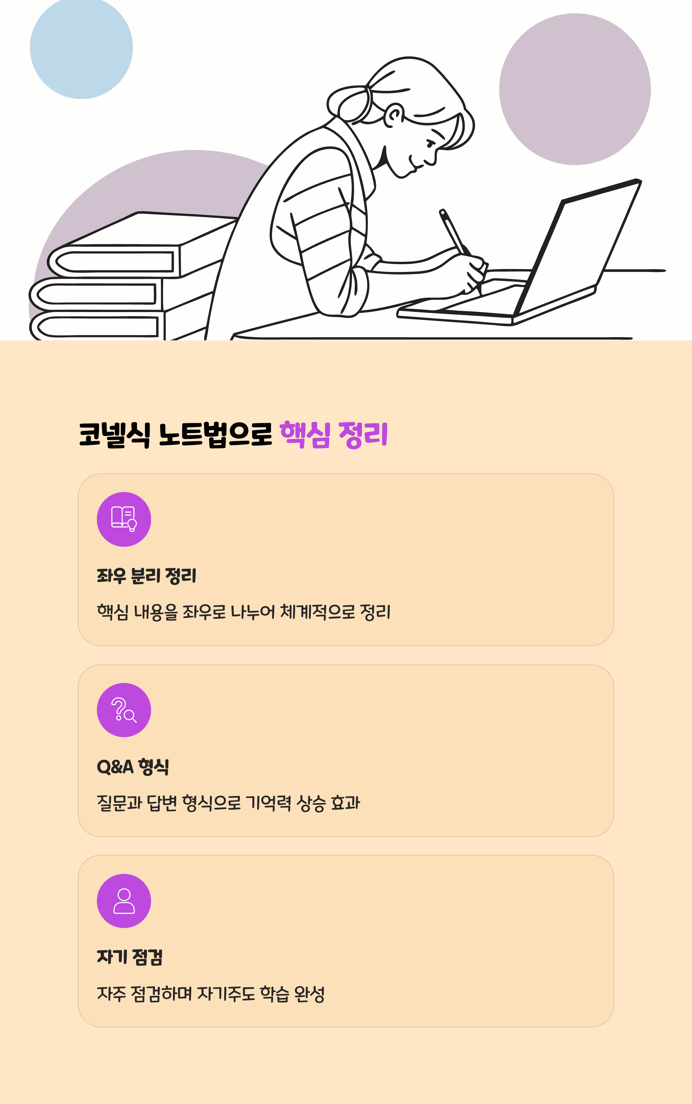 오답노트는 코넬식 노트법으로, 왼쪽엔 핵심 요점/오른쪽엔 오답 이유, 맨 아래엔 복습 포인트를 추가해 자주 확인합니다.