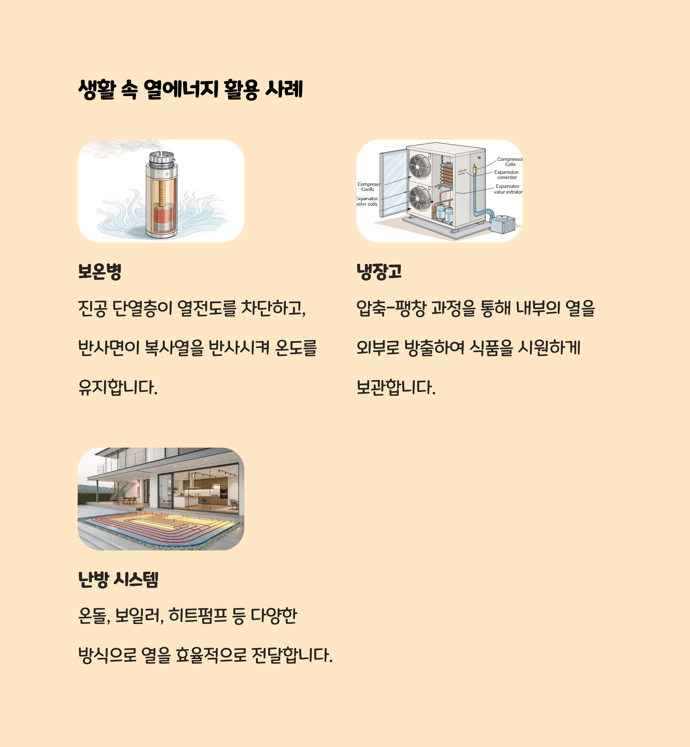 - 보온병의 원리, 에어컨과 난방기의 작동, 자동차 엔진의 열 관리 등
