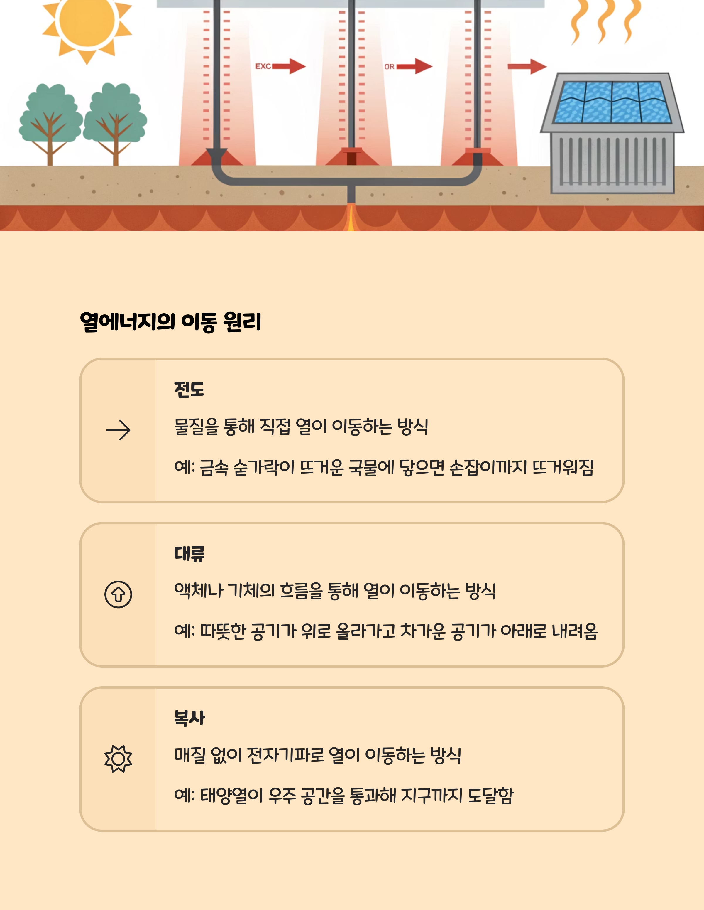 열의 이동(전도, 대류, 복사), 비열, 열팽창 등 물리적 원리를 다룹니다.- 온도와 열의 차이, 에너지 보존 법칙을 이해하는 것이 중요합니다.