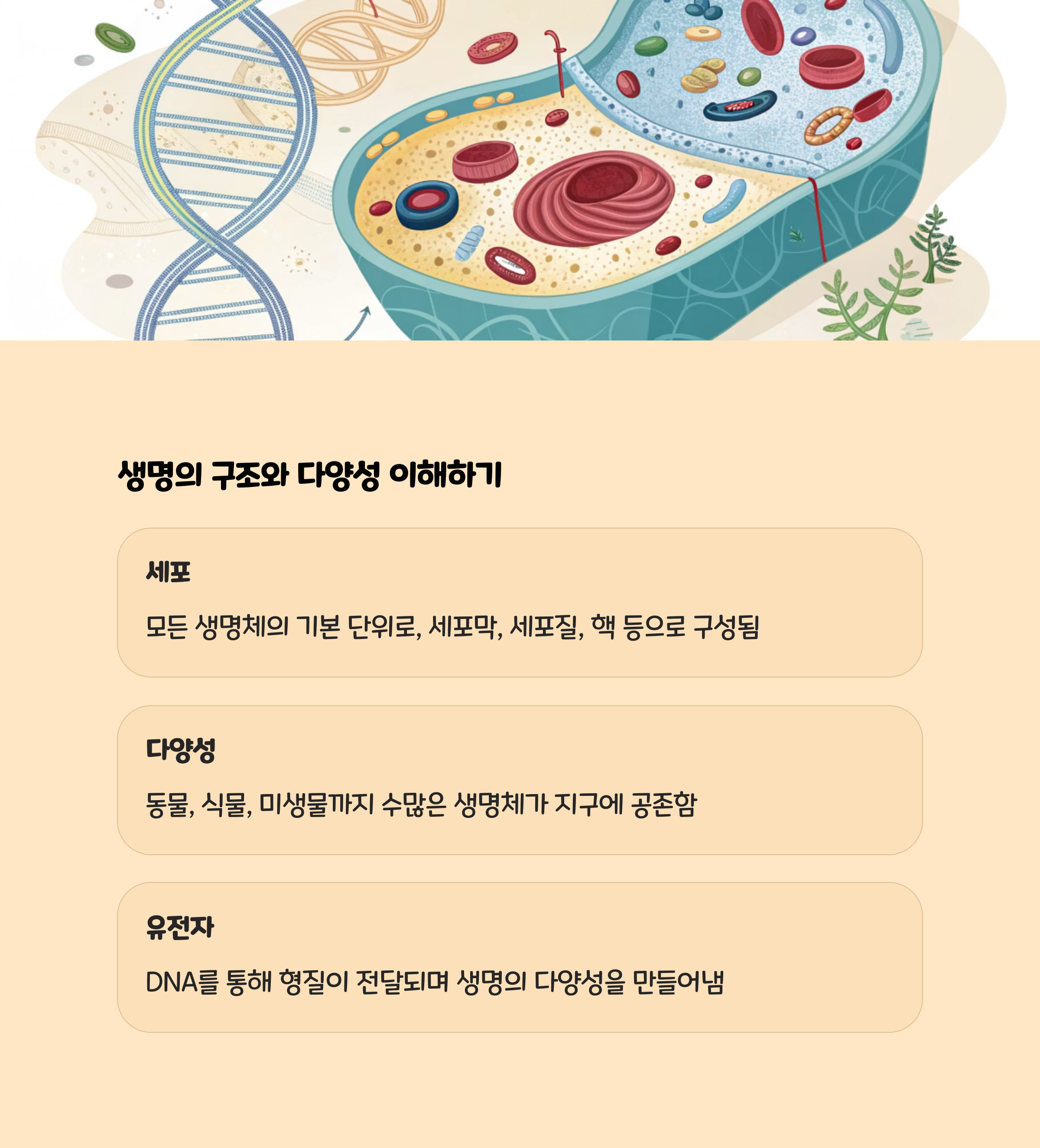 | 생명의 구조와 다양성 | 세포 구조, 생물 분류, 생물 다양성 | 유전자 검사, 멸종 위기종 보호, 도시 생태계 |