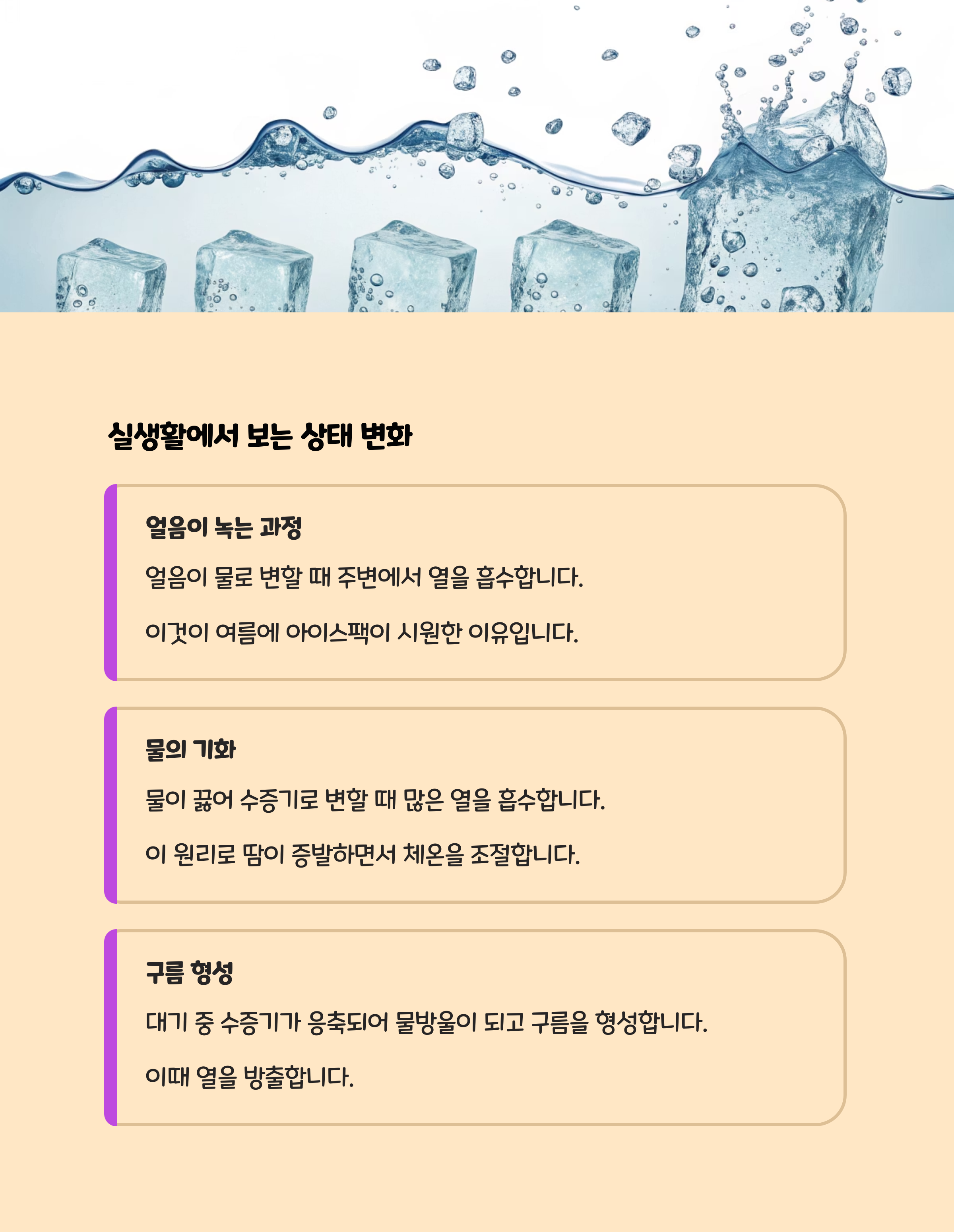 | 물질의 변화 | 입자 운동, 상태 변화, 열에너지 이동 | 냉장고, 김 서림, 드라이아이스, 증발·응축 현상 |