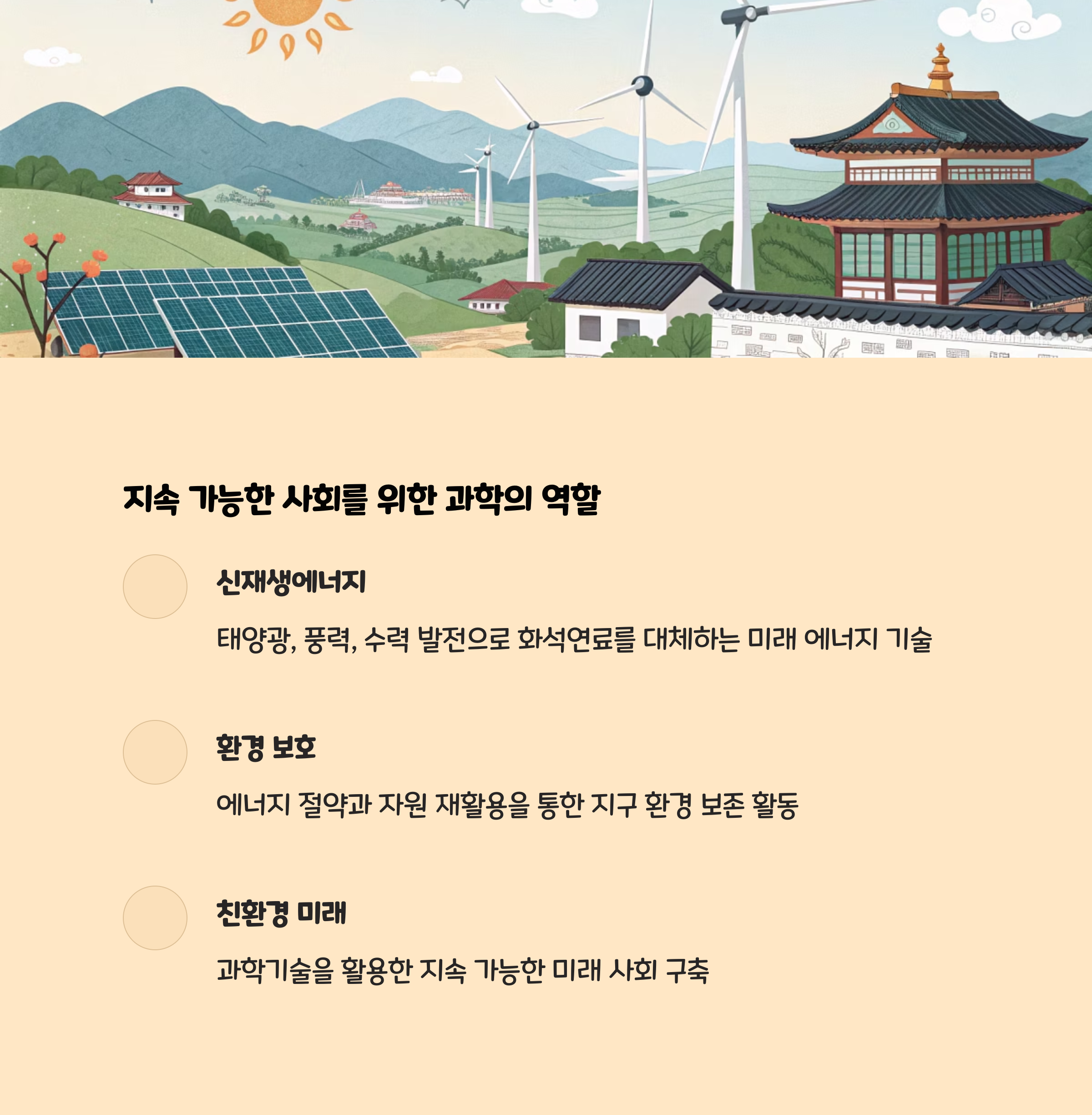 | 지속 가능한 사회와 과학 | 과학적 탐구, 환경 보전, 데이터 해석 | 신재생에너지, 환경 캠페인, 에너지 절약 실천 |