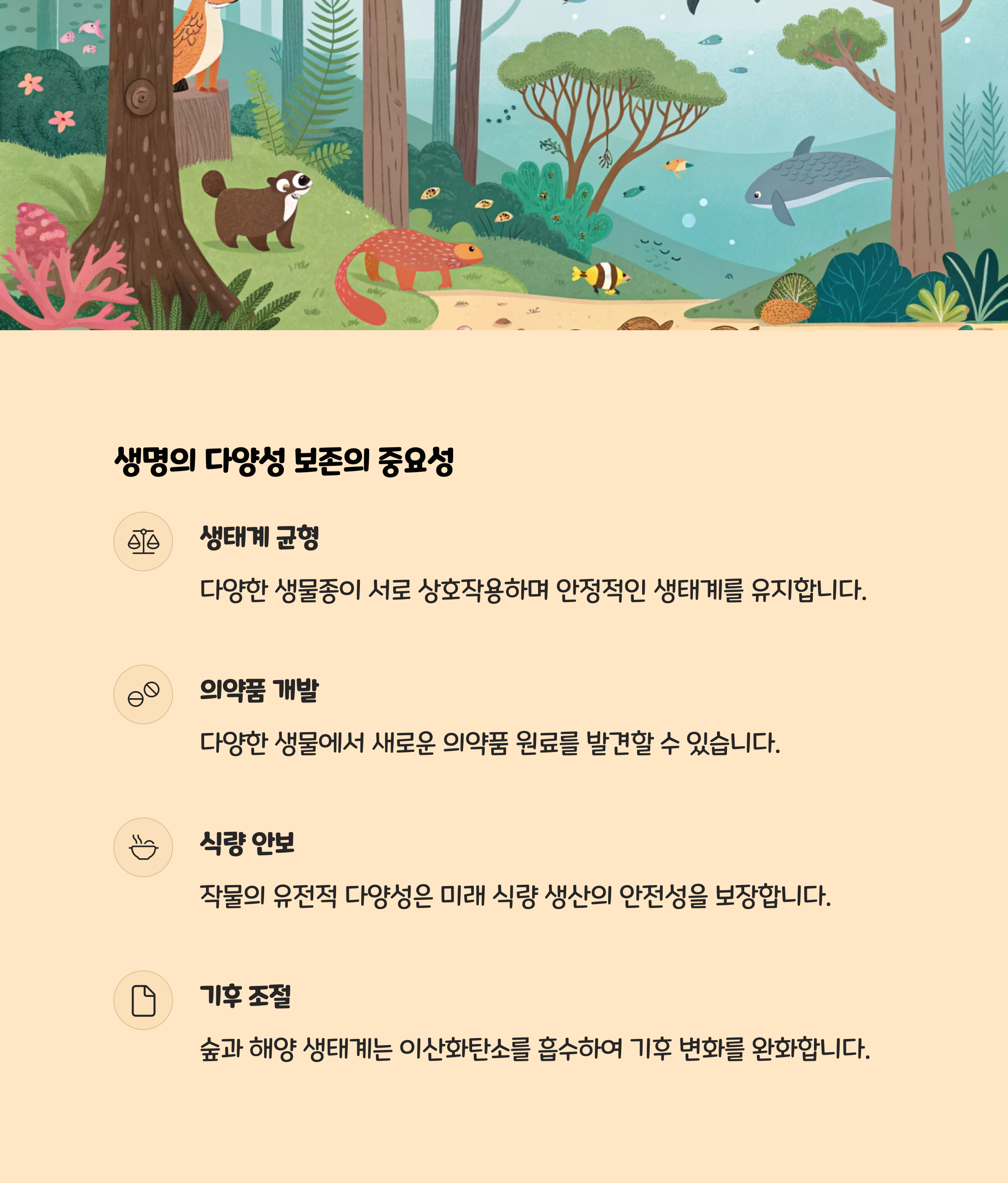 모든 생명체는 세포로 이루어져 있으며, 세포의 구조와 기능이 다릅니다.- 생물의 분류 기준, 생물 다양성의 중요성, 멸종 위기종 보호의 필요성 등이 포함됩니다.