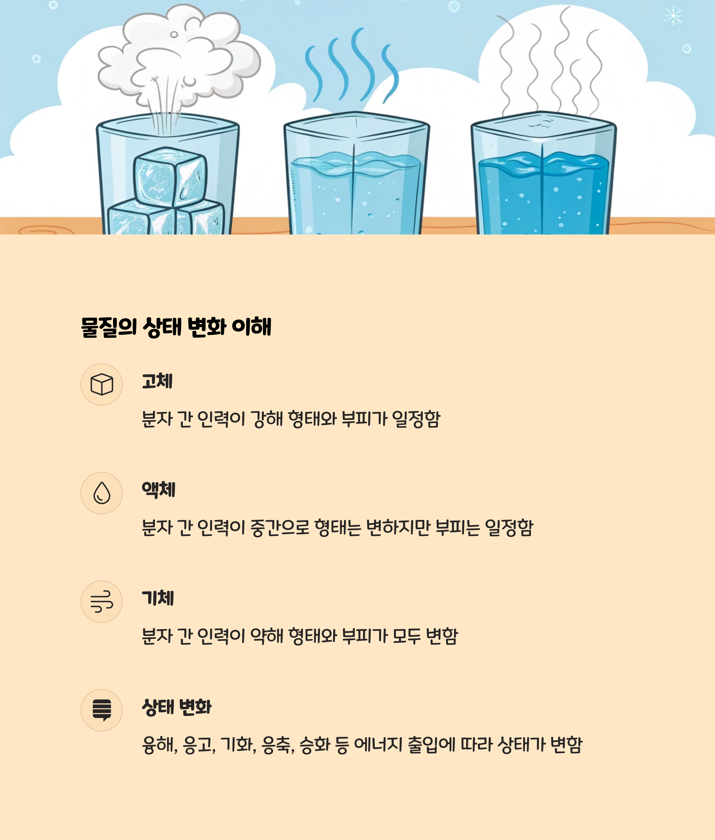 입자의 운동, 상태 변화(고체-액체-기체), 상태 변화에 따른 열에너지의 이동- 증발, 응축, 융해, 승화 등 다양한 변화 과정을 이해합니다.