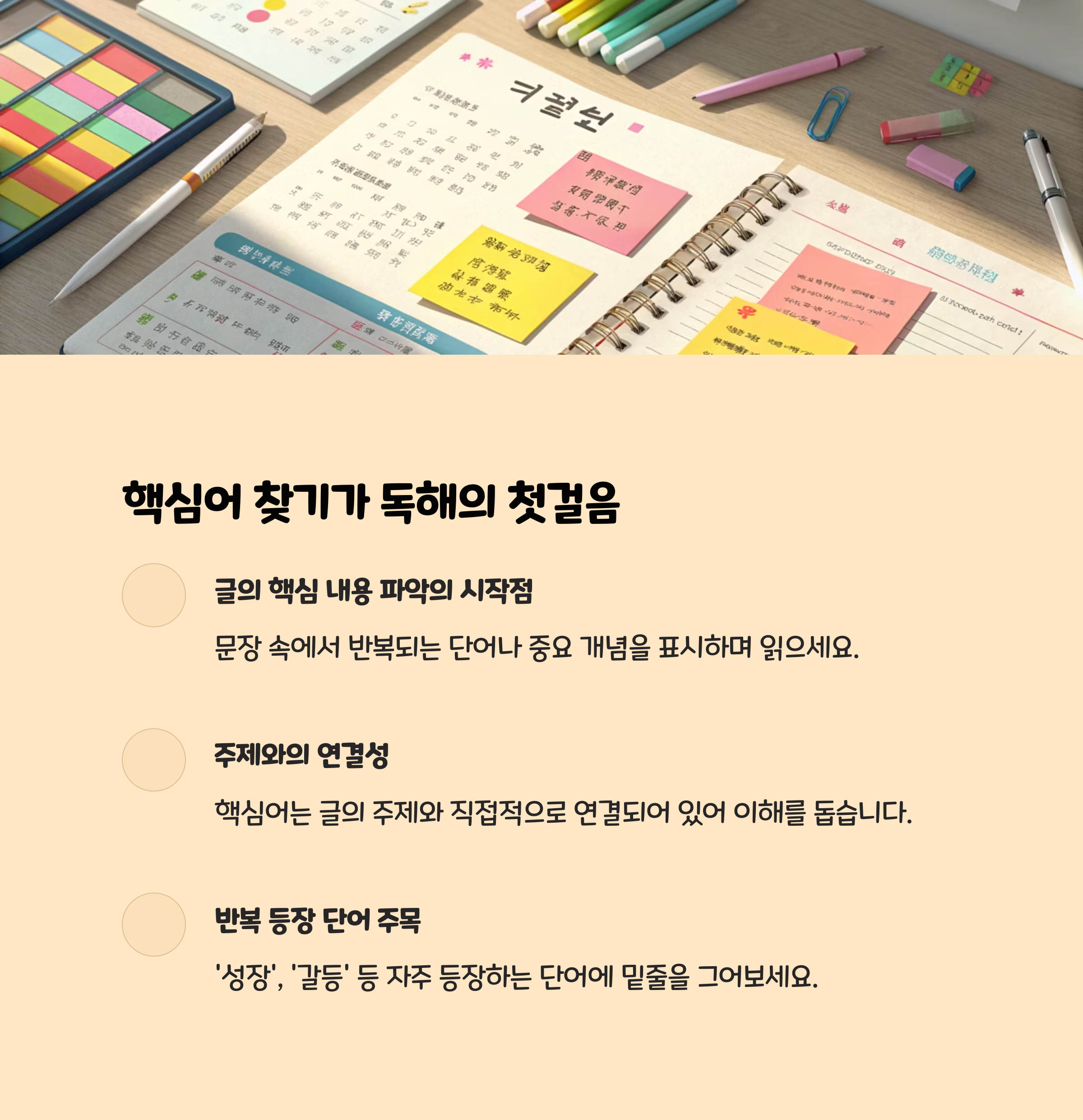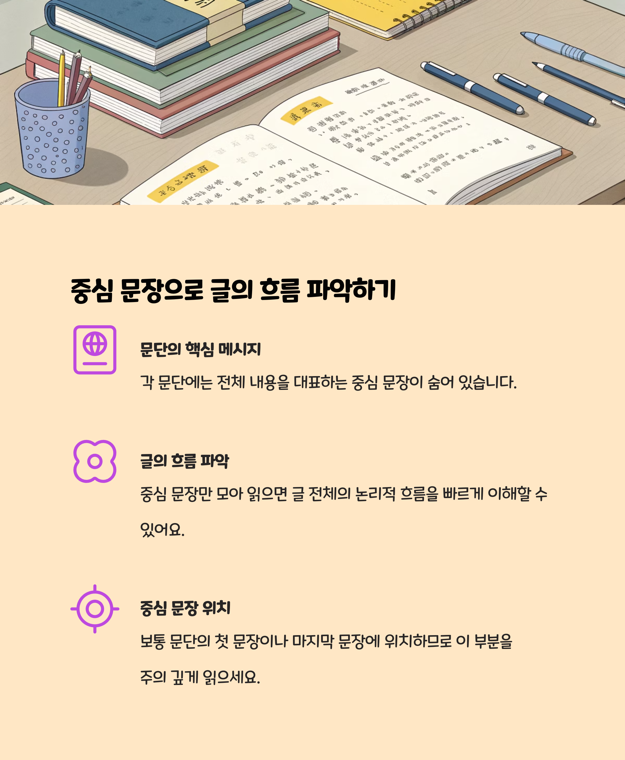 독해력을 키우기 위해서는 글을 읽을 때 핵심어와 중심 문장을 찾아내는 연습부터 시작하는 것이 좋습니다. 지문을 읽으며 중요한 단어와 문장을 표시하고, 각 문단의 요지를 스스로 정리해보는 습관을 들이면 글의 구조와 흐름을 쉽게 파악할 수 있습니다.