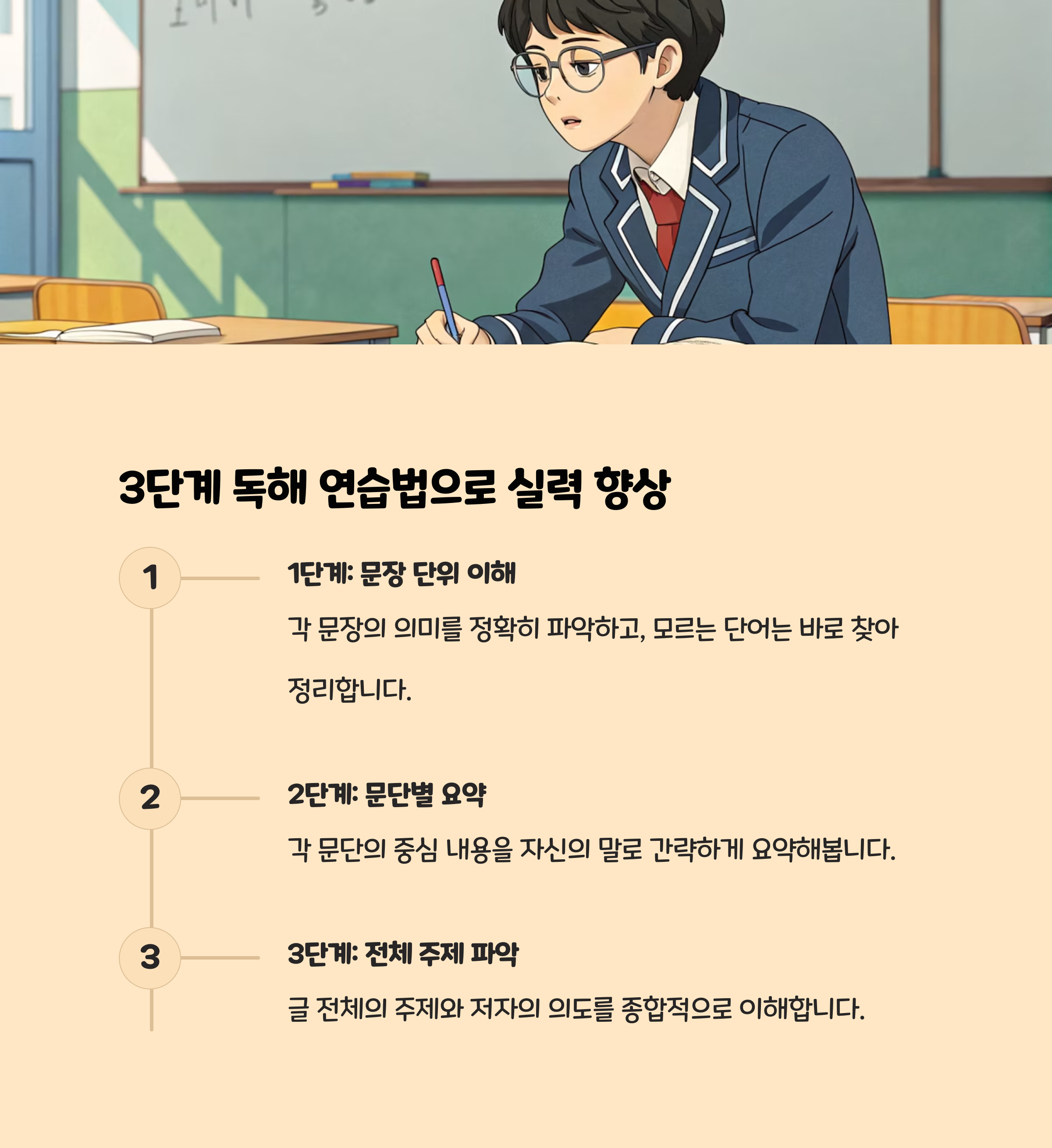 1단계: 독해 원리 도식화 및 개념 정리2단계: 실제 지문 읽기와 키워드, 주제 파악3단계: 실전 문제 적용 및 어휘력 강화