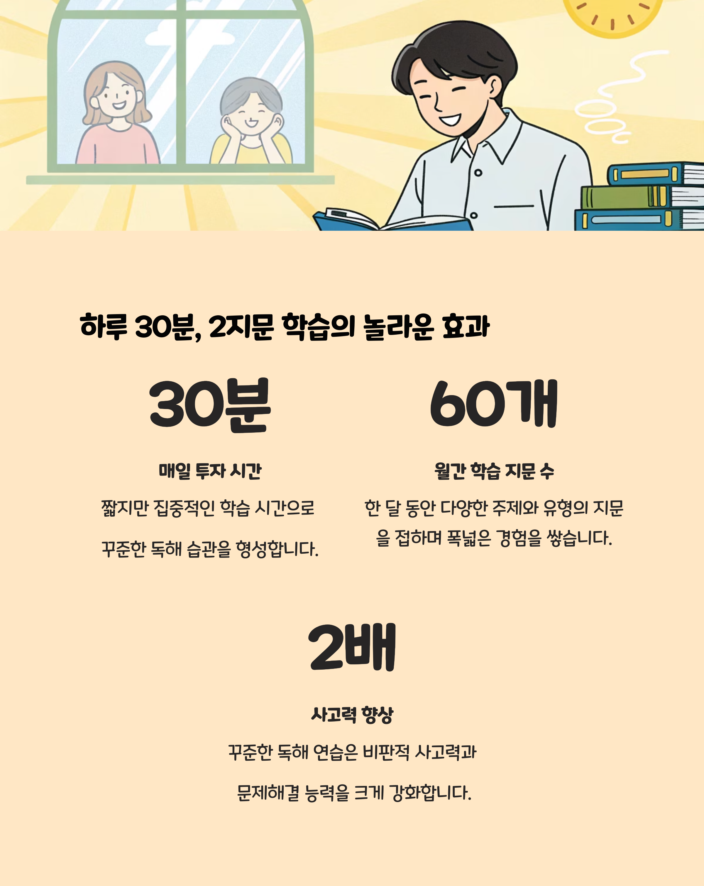 이러한 단계별 학습은 하루 2지문, 30분 학습으로 자기주도 학습 습관까지 기를 수 있다는 장점이 있습니다.