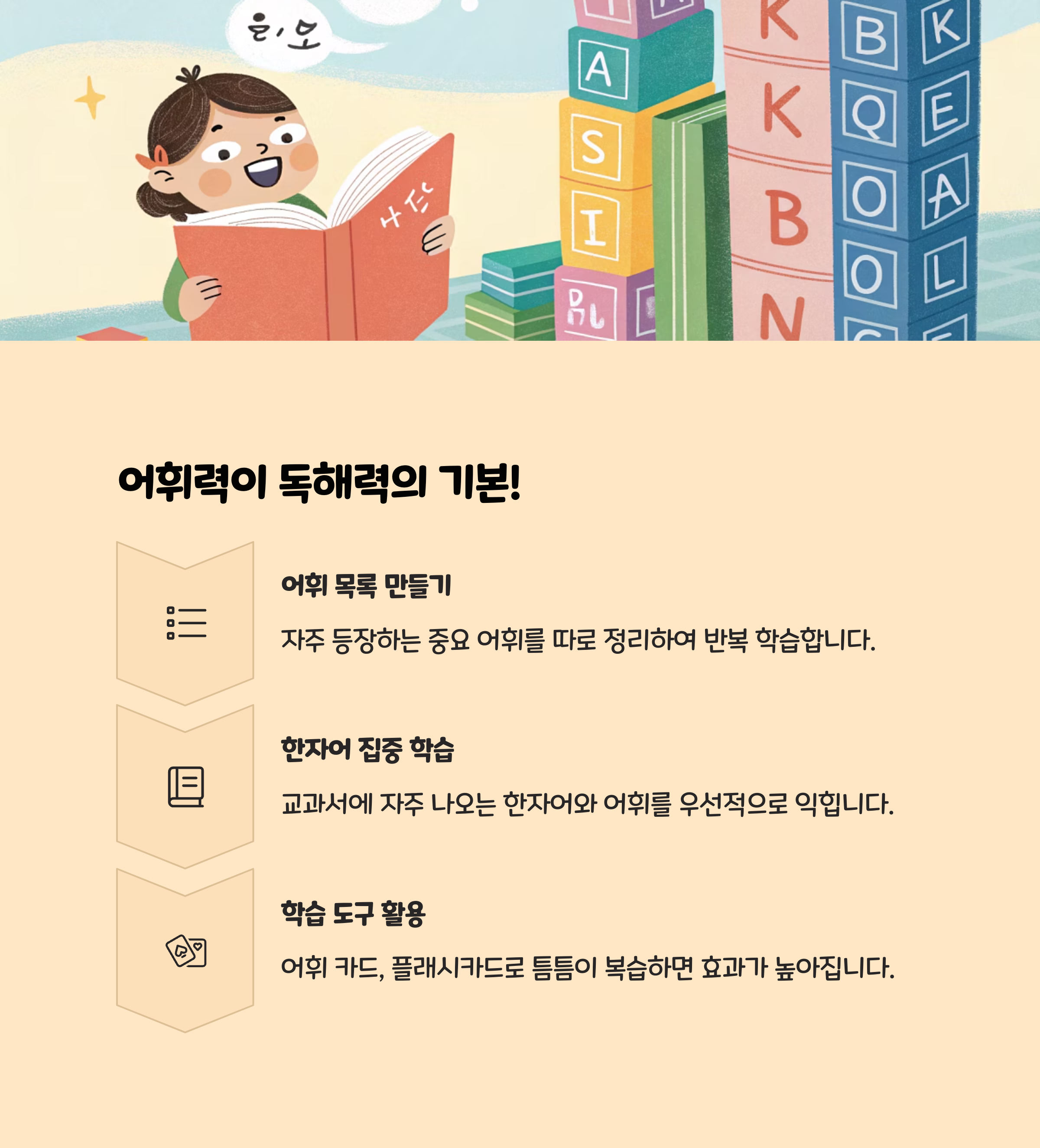 어휘력은 글의 내용을 정확히 이해하는 데 필수적인 능력입니다. 모르는 단어가 많으면 전체 지문의 의미를 오해하기 쉽고, 문제 풀이에도 어려움을 겪게 됩니다. 평소에 다양한 어휘를 익히고, 모르는 단어는 바로 찾아보는 습관을 들이면 독해력도 자연스럽게 향상됩니다.