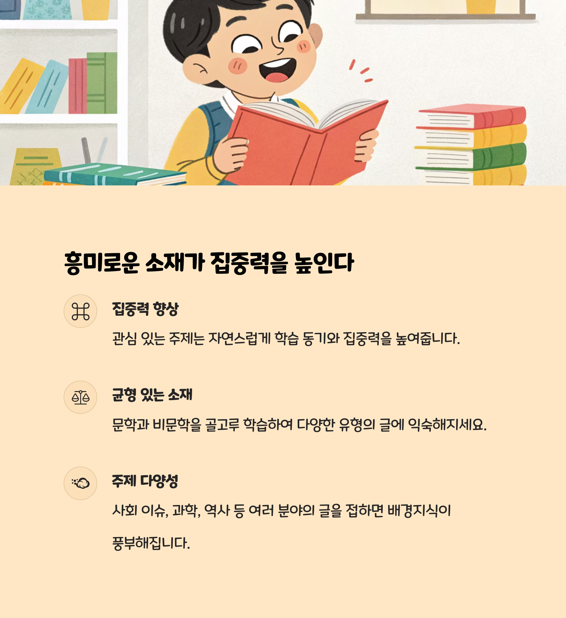 흥미와 수준에 맞는 지문을 제공하는 것도 중요합니다.