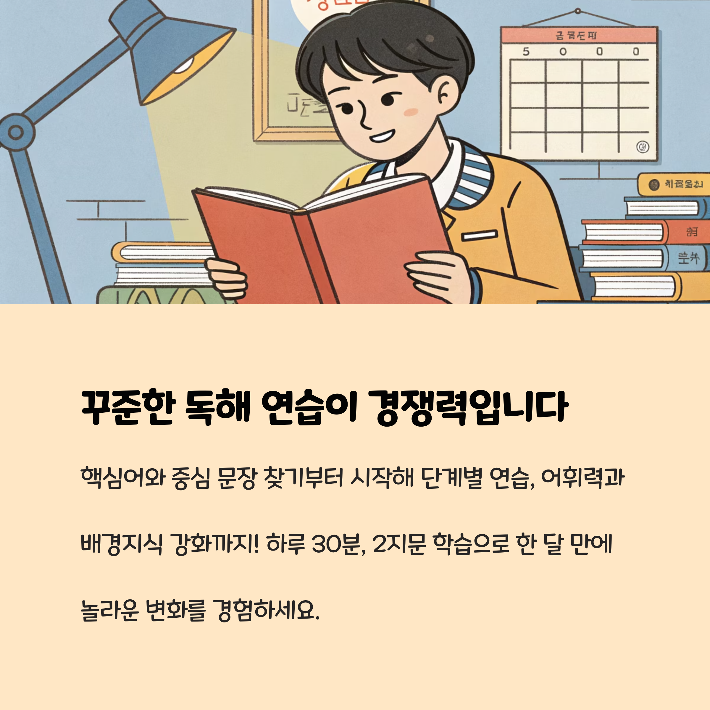 - 하루 2지문씩, 30분 동안 집중해서 읽고 문제를 푸는 습관을 들이면, 한 달(25~30일)만에 최소 50~60개의 다양한 지문을 경험할 수 있습니다.