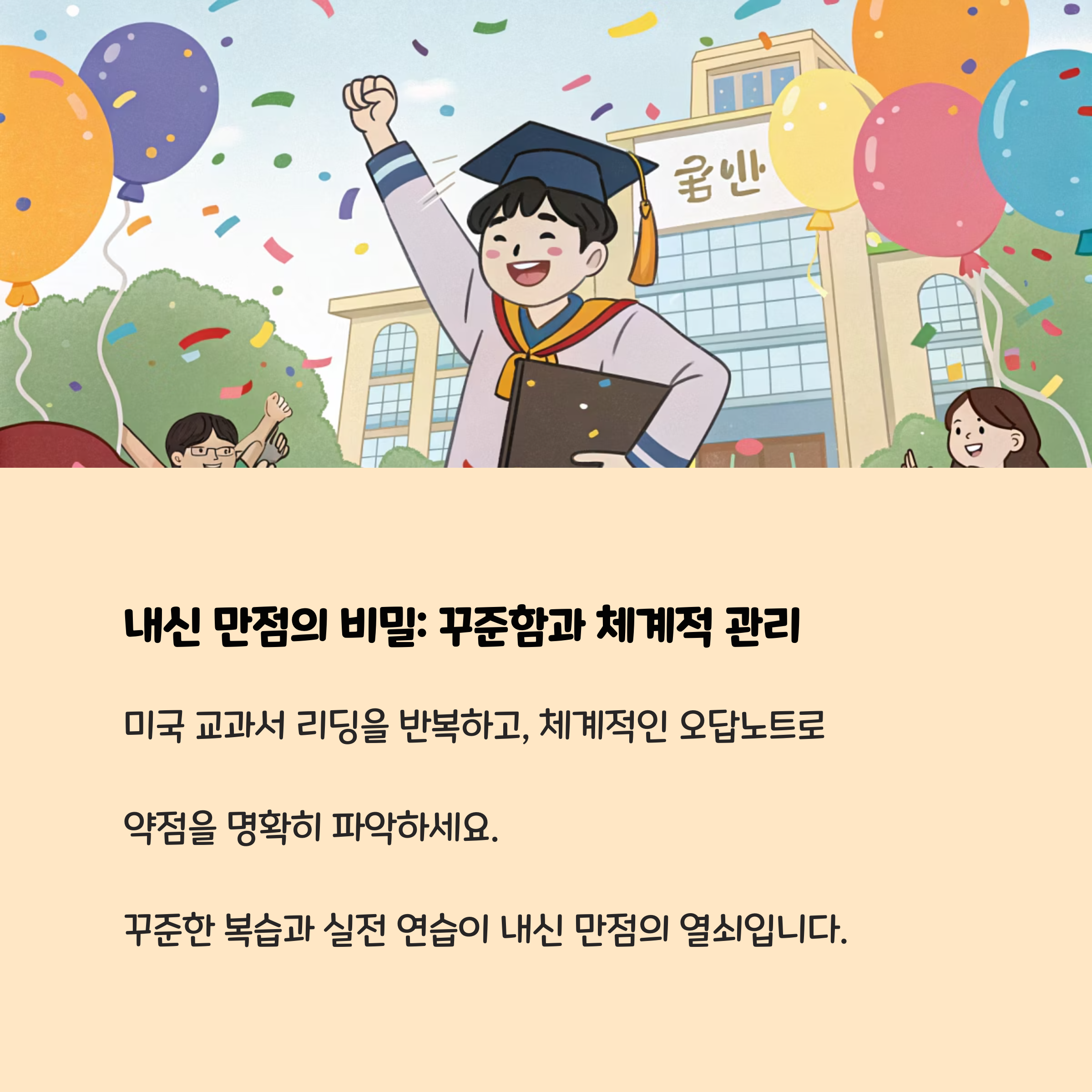 교과서 중심 리딩과 체계적인 오답노트 작성은 2025년 내신 영어 고득점을 위한 가장 확실한 전략입니다. 반복 학습과 꼼꼼한 오답 정리를 통해, 단순 암기를 넘어 실전에서 바로 적용 가능한 영어 실력을 키워보세요.