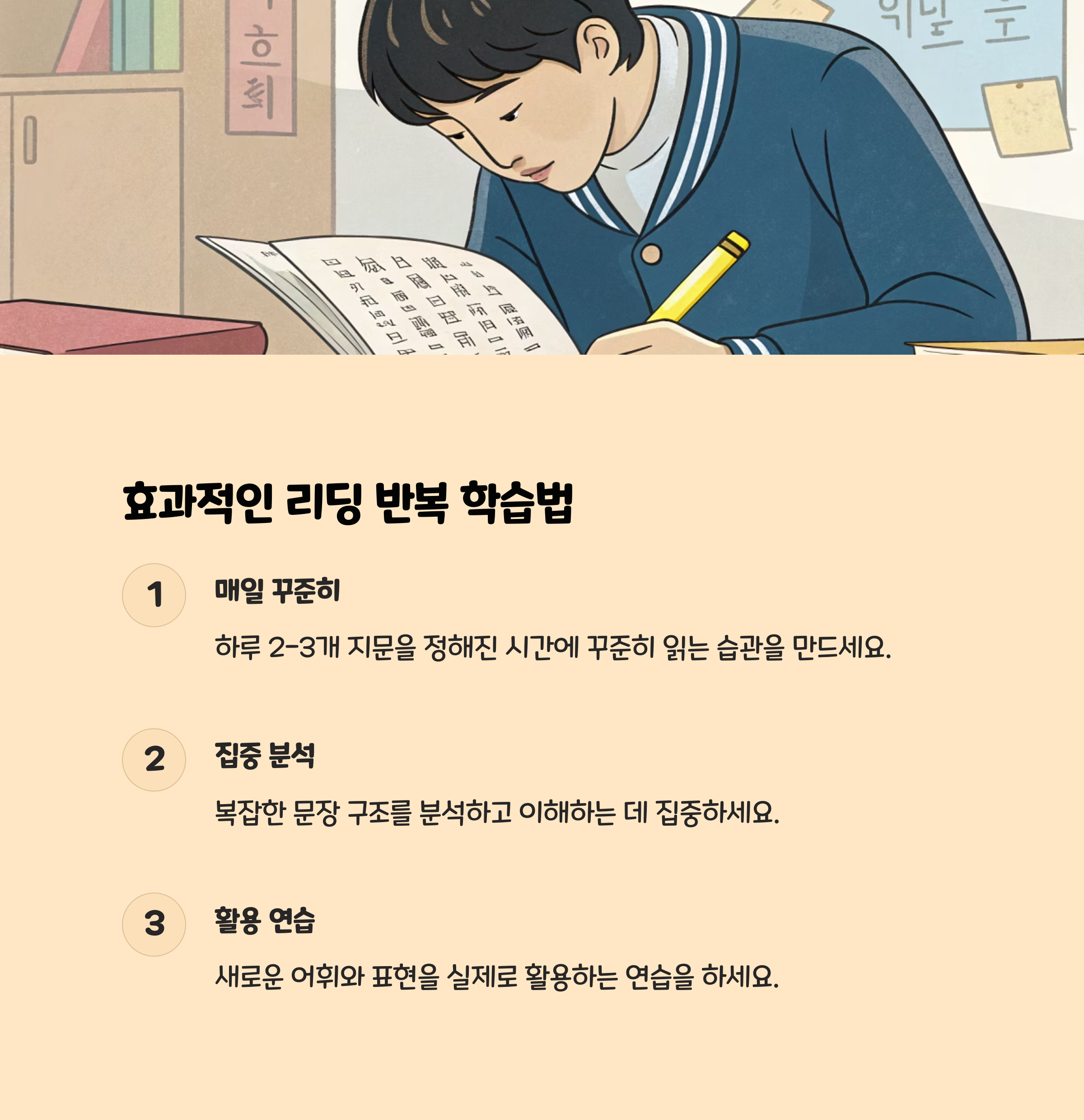| 리딩 반복 | 교과서 본문 3회 이상 소리 내어 읽기, 핵심 표현 노트 작성 |