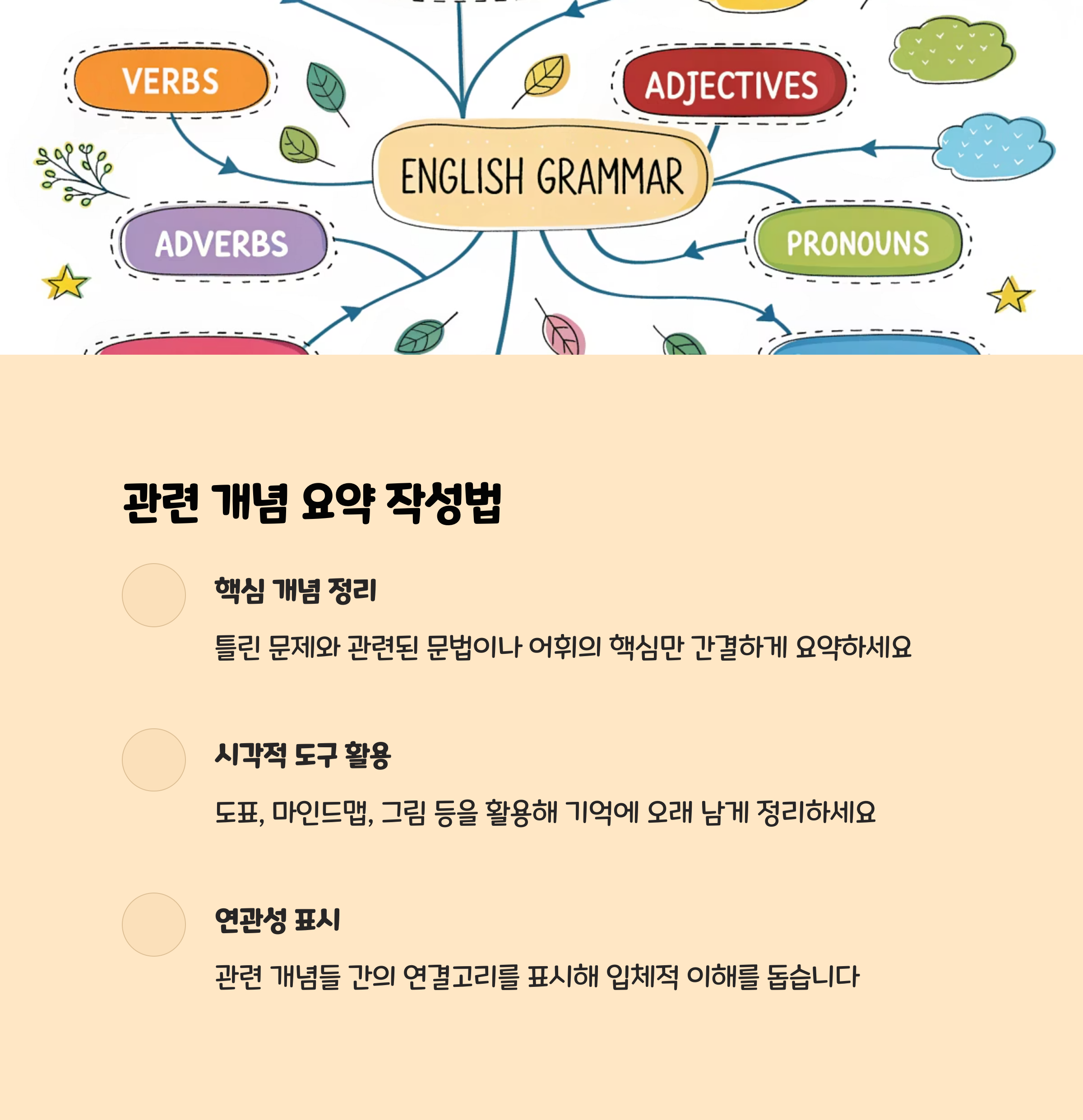 문제 유형별 정리: 단순히 문제를 옮기지 말고, 문법/어휘/구문/독해 등 영역별로 분류해 작성합니다.틀린 이유 명확히 기록: “접속사 해석 착오”, “빈도부사 위치 혼동” 등 구체적으로 적습니다.핵심 개념 강조: 반드시 암기해야 할 문법이나 표현은 색펜, 도형 등으로 눈에 띄게 표시합니다.유사 문제 반복: 오답 유형과 비슷한 문제를 추가로 풀어보고, 틀린 부분이 반복되는지 점검합니다.정리된 노트로 시험 직전 복습: 시험 전날에는 오답노트와 요약노트만 집중적으로 훑어보며, 새로운 내용 암기는 지양합니다.