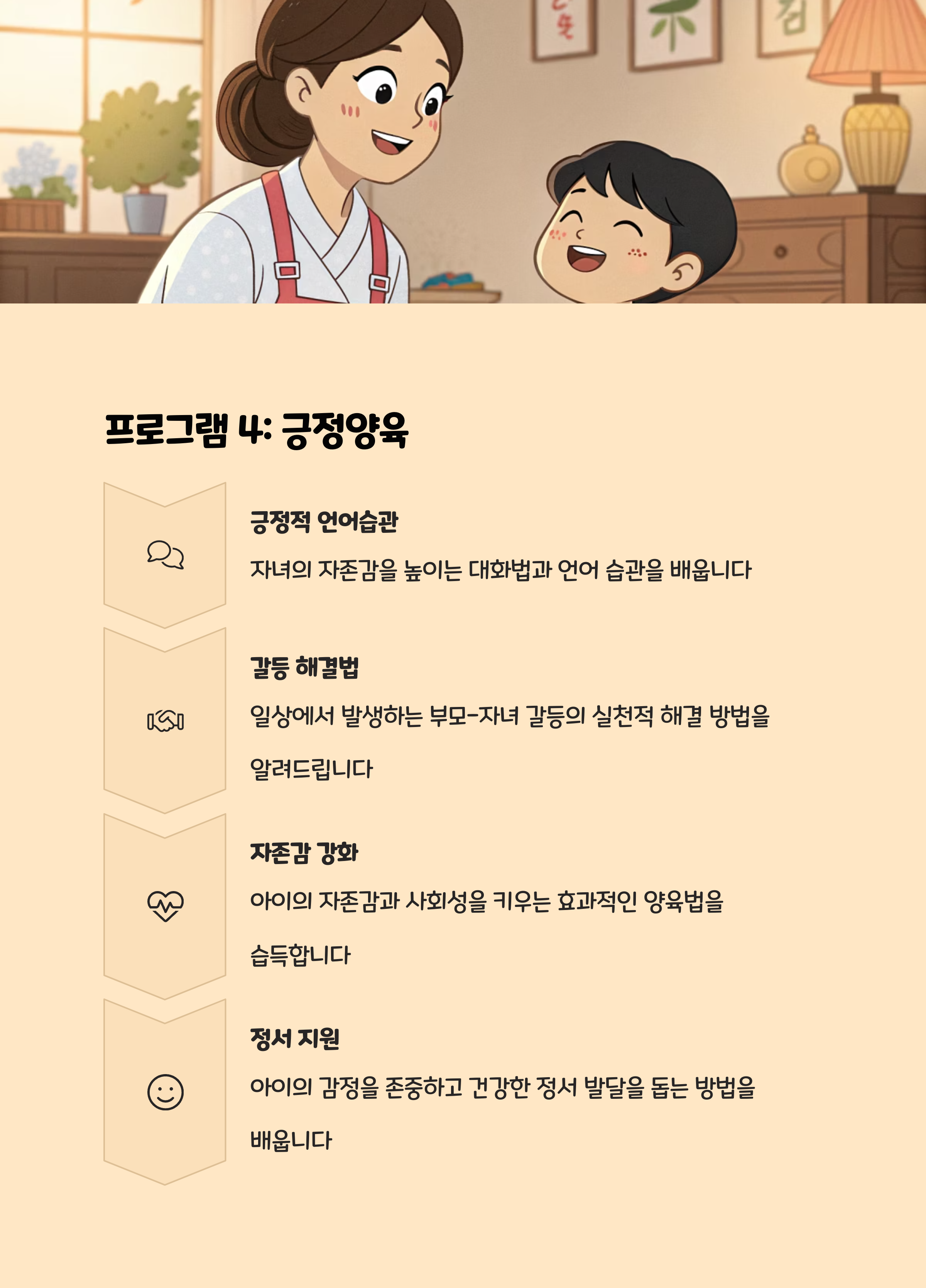 - 자녀권리존중: 아이의 권리와 인권을 존중하는 양육법을 안내합니다.