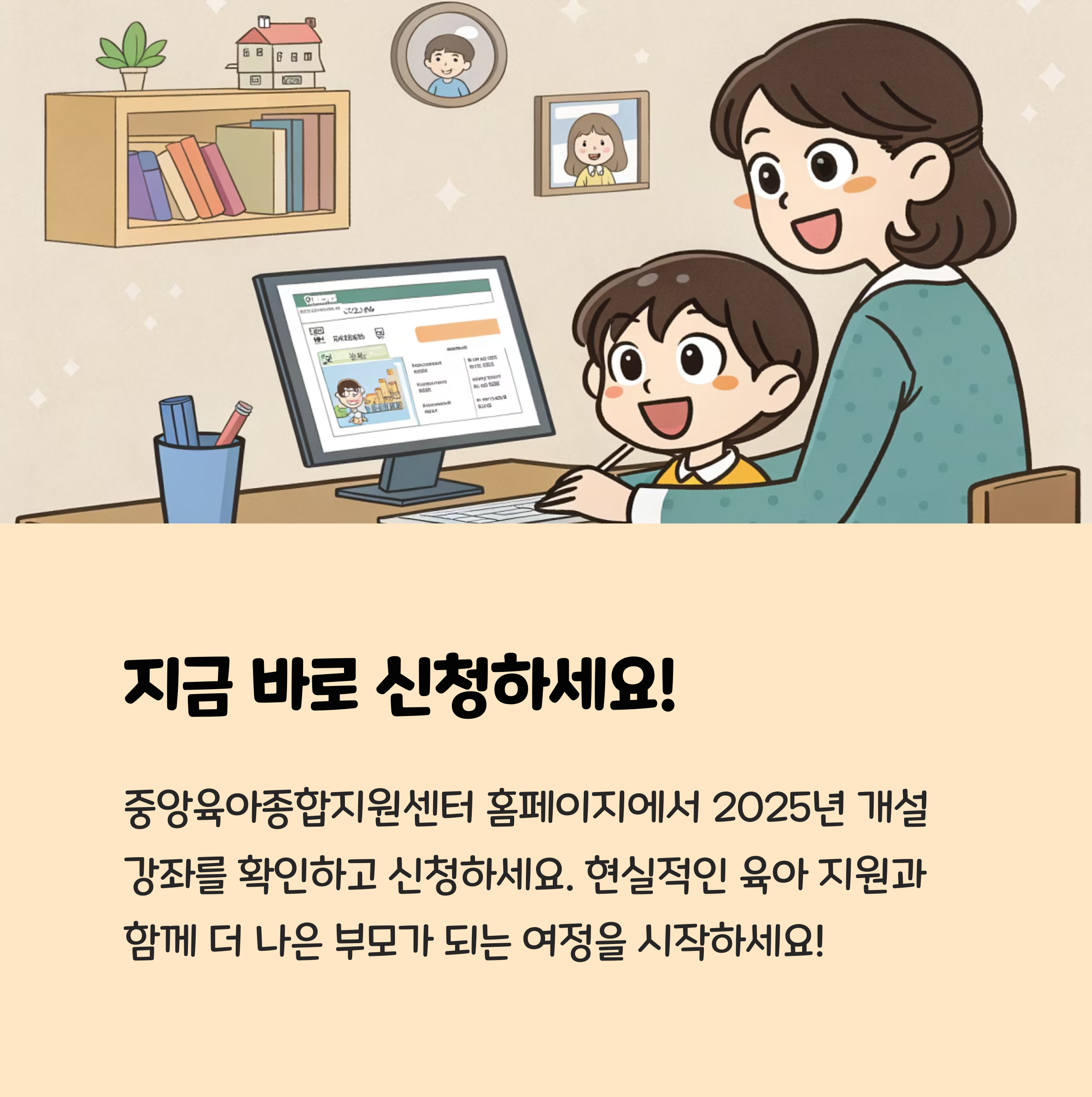 신청 기간: 2025년 1월 1일 ~ 12월 31일수강 방법: 중앙육아종합지원센터 공식 홈페이지에서 온라인 신청 후, PC나 모바일로 수강수강 인원: 각 강좌별 최대 5,000명(일부 강좌 10,000명)까지 선착순 모집비용: 전 강좌 무료