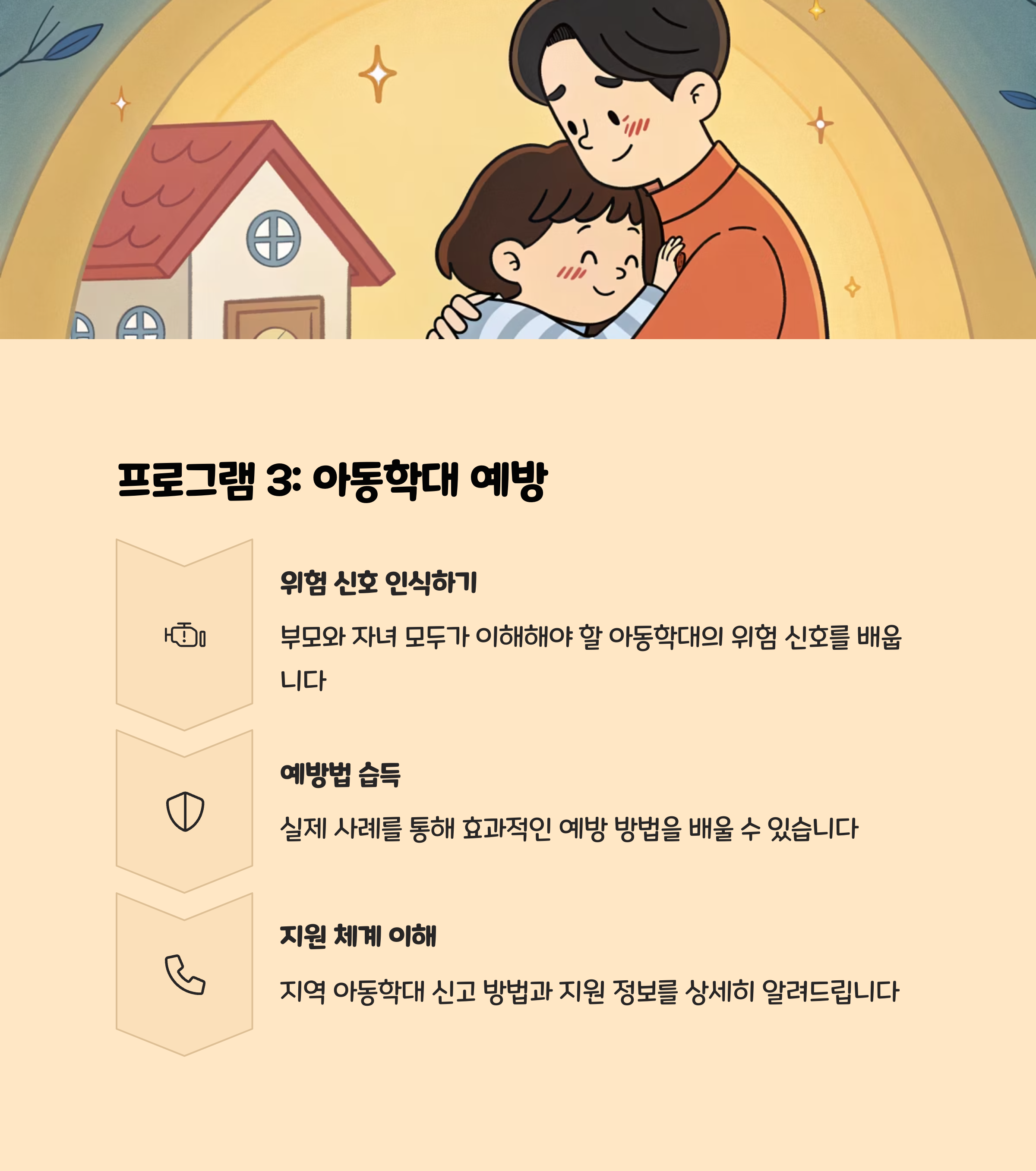 - 아동학대 예방 부모교육(이론/사례편): 2,130명(이론), 1,197명(사례)이 참여할 정도로 관심이 높으며, 실제 사례 중심의 예방 교육을 제공합니다.
