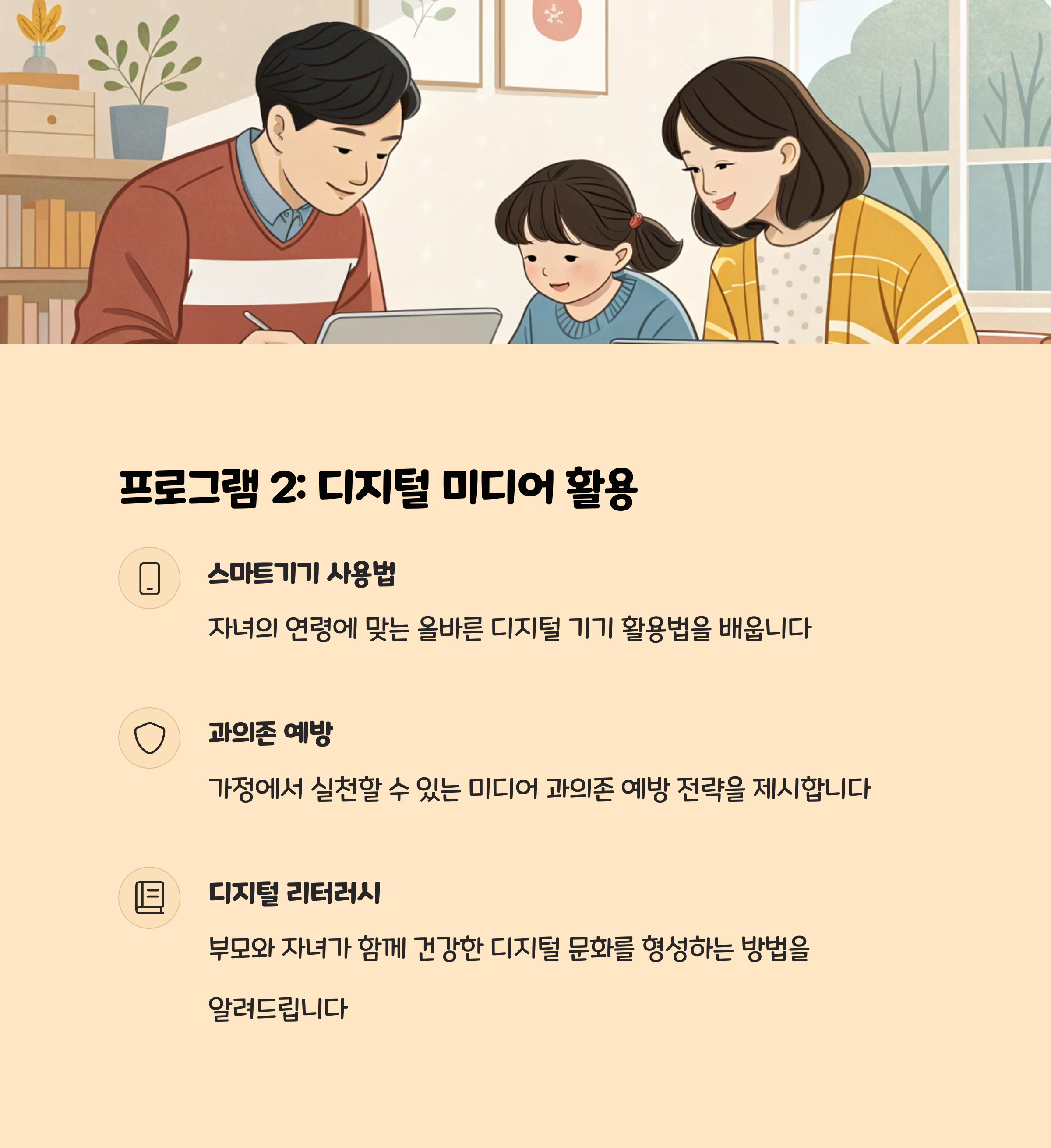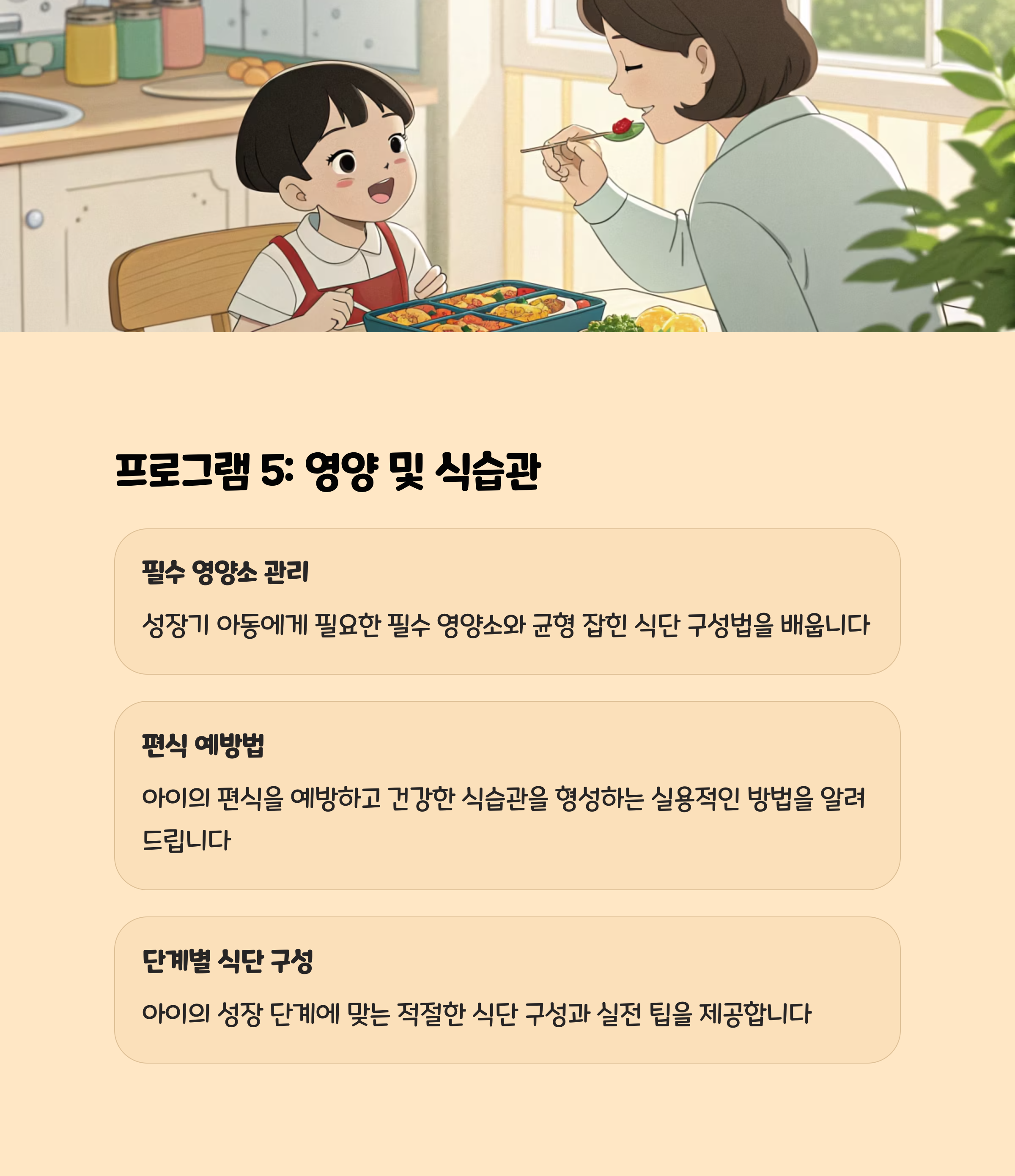 • 자녀권리존중: 아이의 권리와 인권을 존중하는 양육법을 안내합니다.