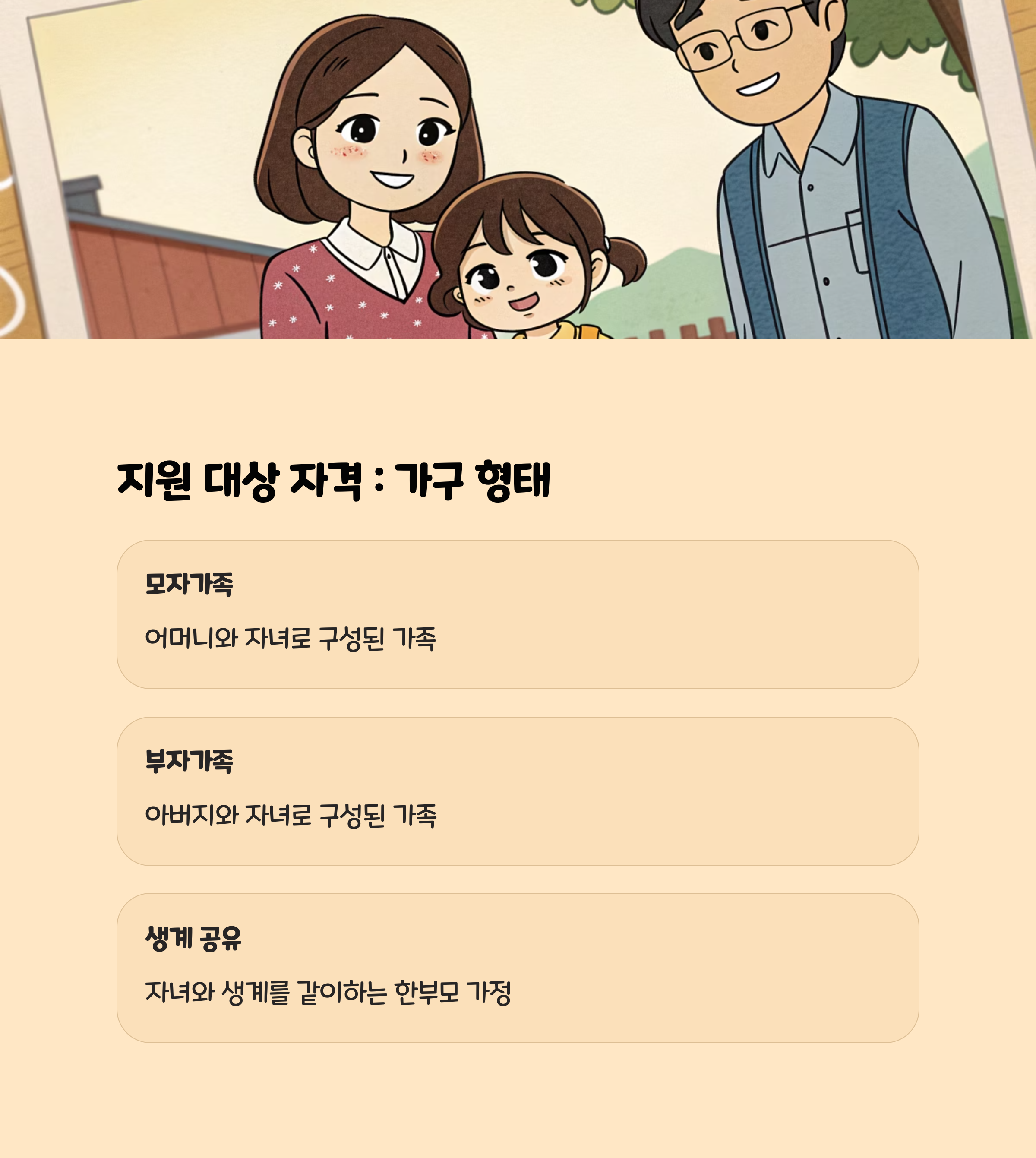 - 부 또는 모와 자녀로만 구성된 가정 (이혼, 사별, 미혼부모, 사실혼 등 모두 해당)