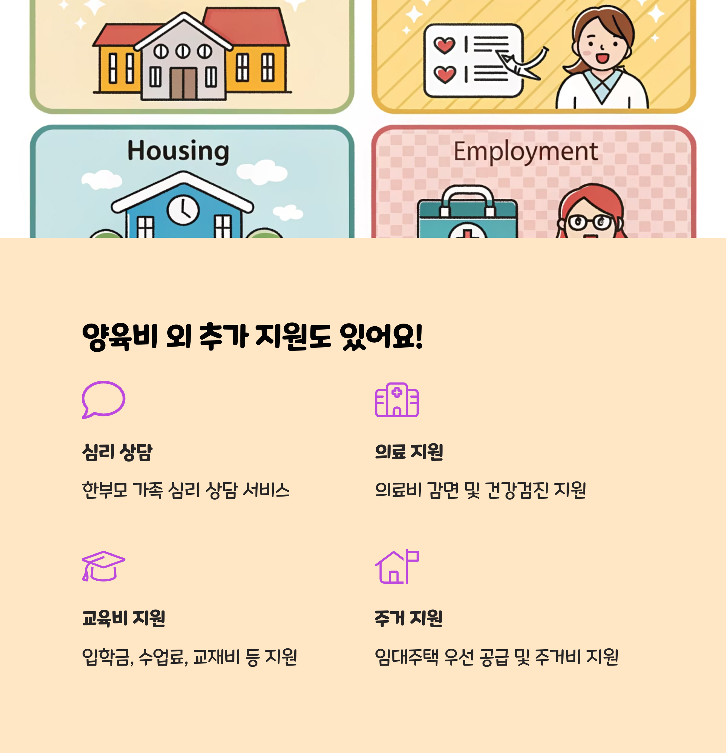 한부모 가정은 아동양육비 외에도 학용품비, 교육비, 의료비, 주거비 등 다양한 복지 혜택을 추가로 받을 수 있습니다. 각 지자체별로 지원 내용이 다르니 확인이 필요합니다.