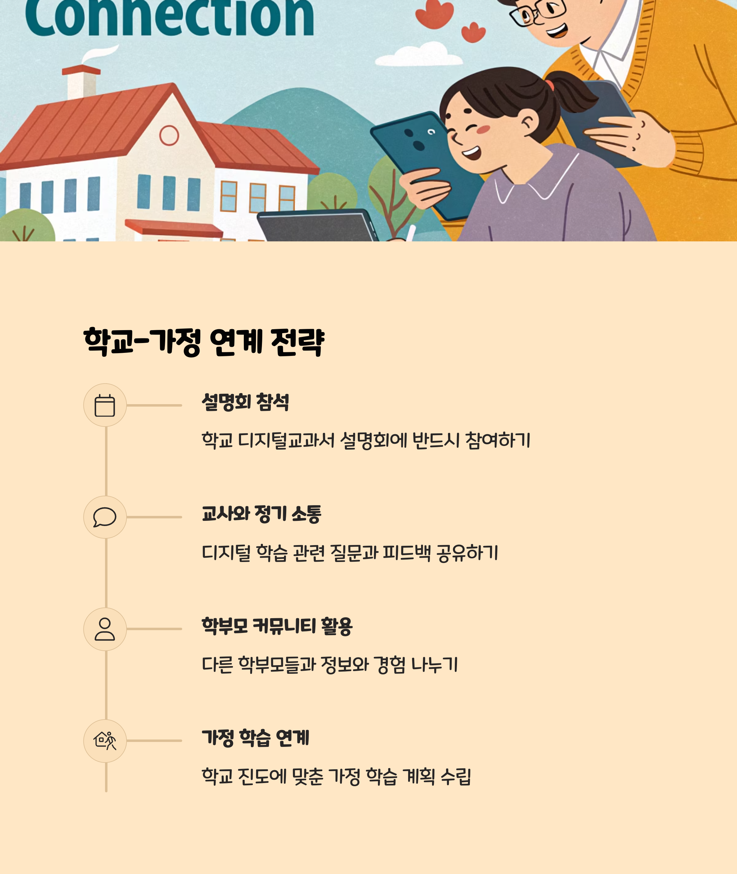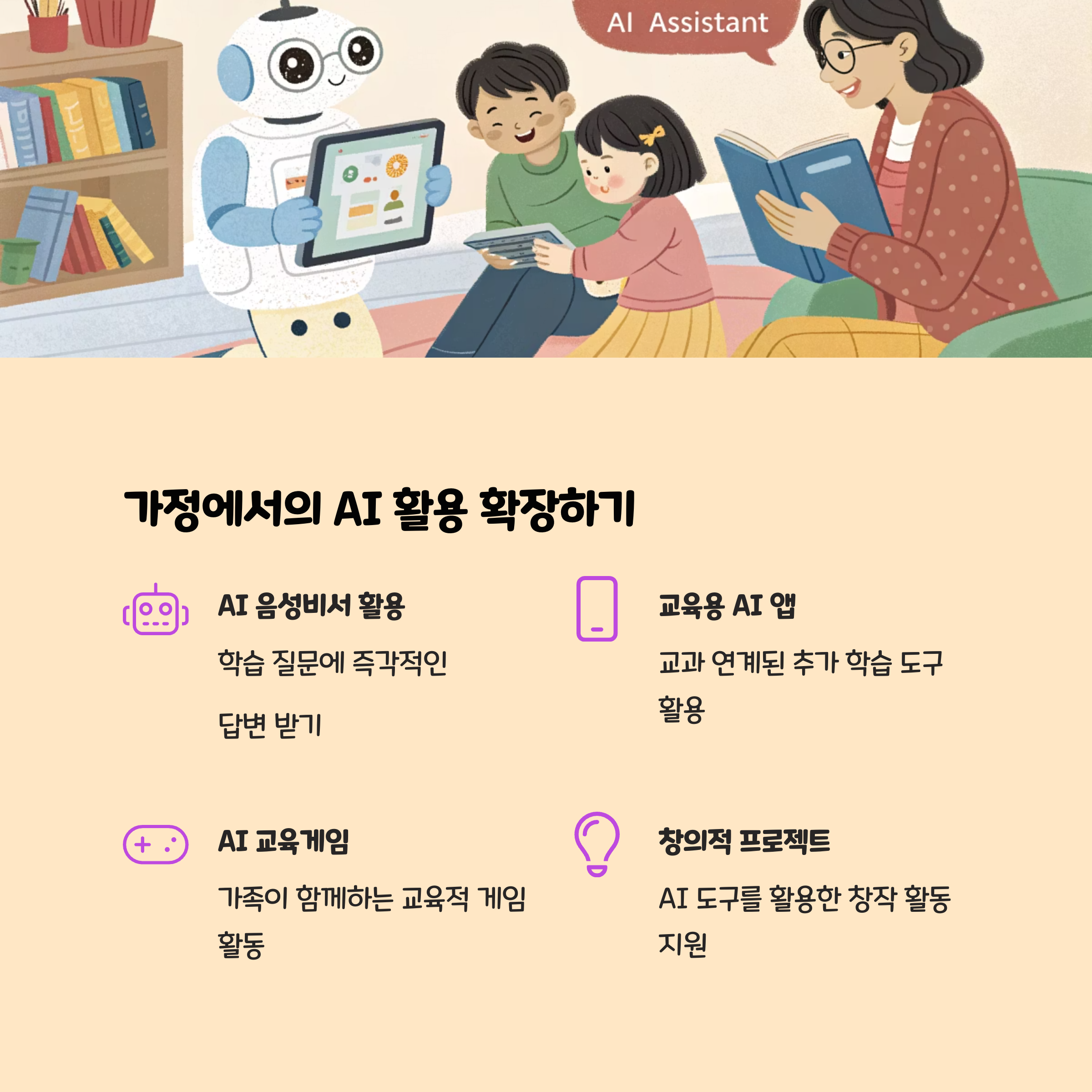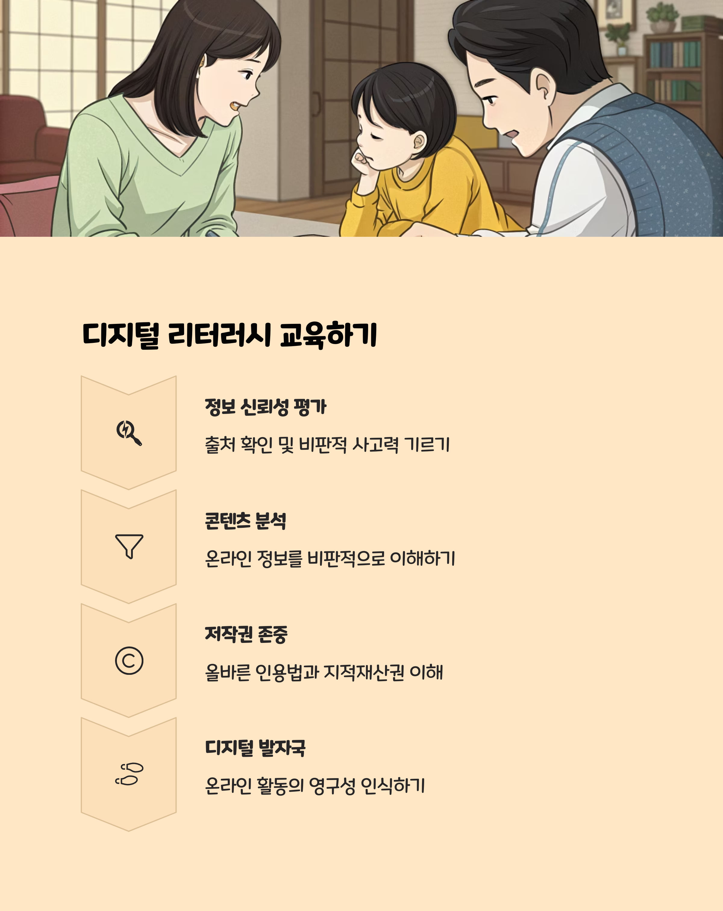 - 디지털 리터러시 : 저작권, 정보 검색, 개인정보 보호 등 기초 교육을 가정에서 반복적으로 지도해야 합니다.