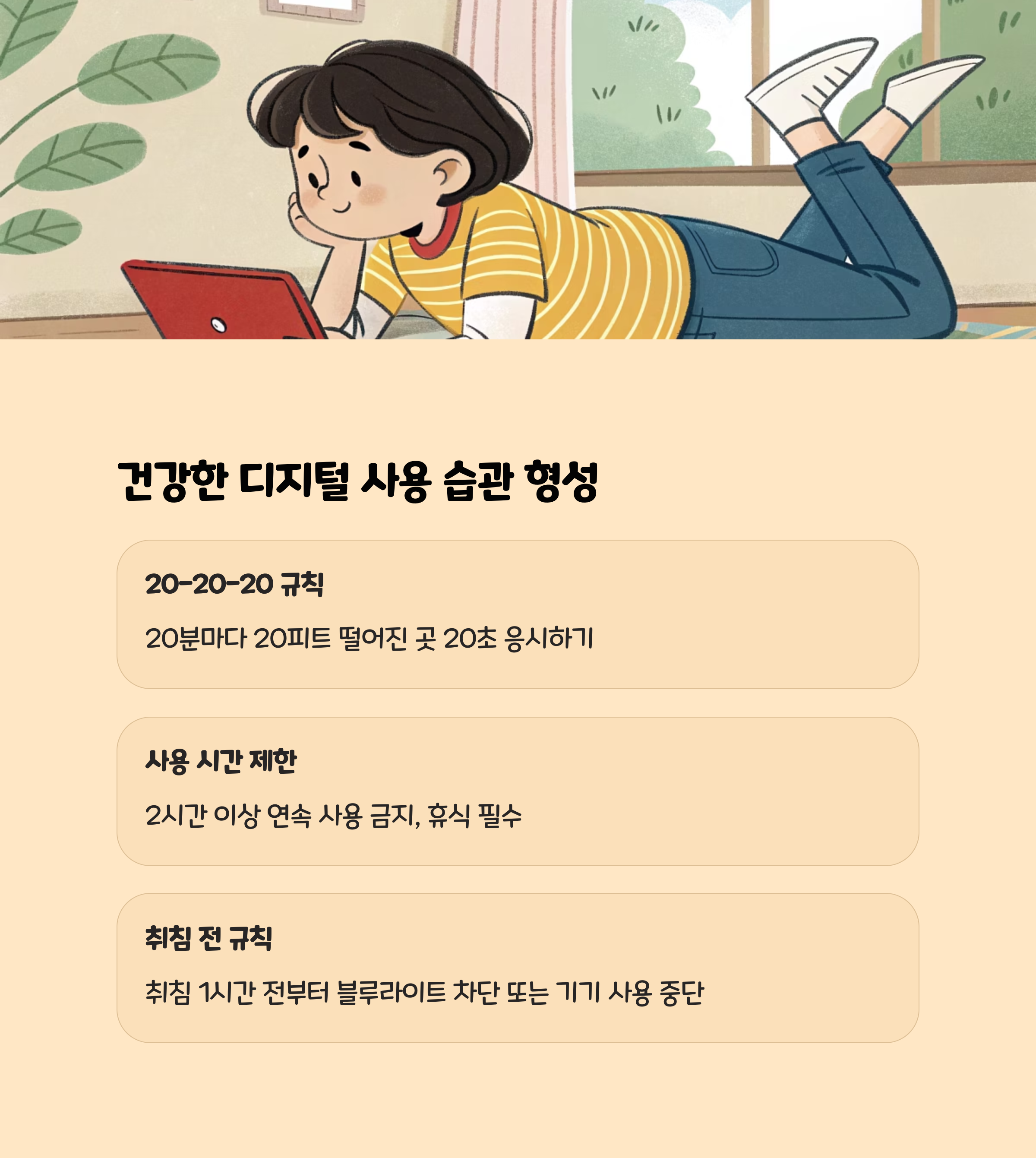 - 학습 시간 관리 : 장시간 기기 사용은 시력 저하, 집중력 저하로 이어질 수 있으니, 학습 시간과 휴식 시간을 명확히 구분하세요.