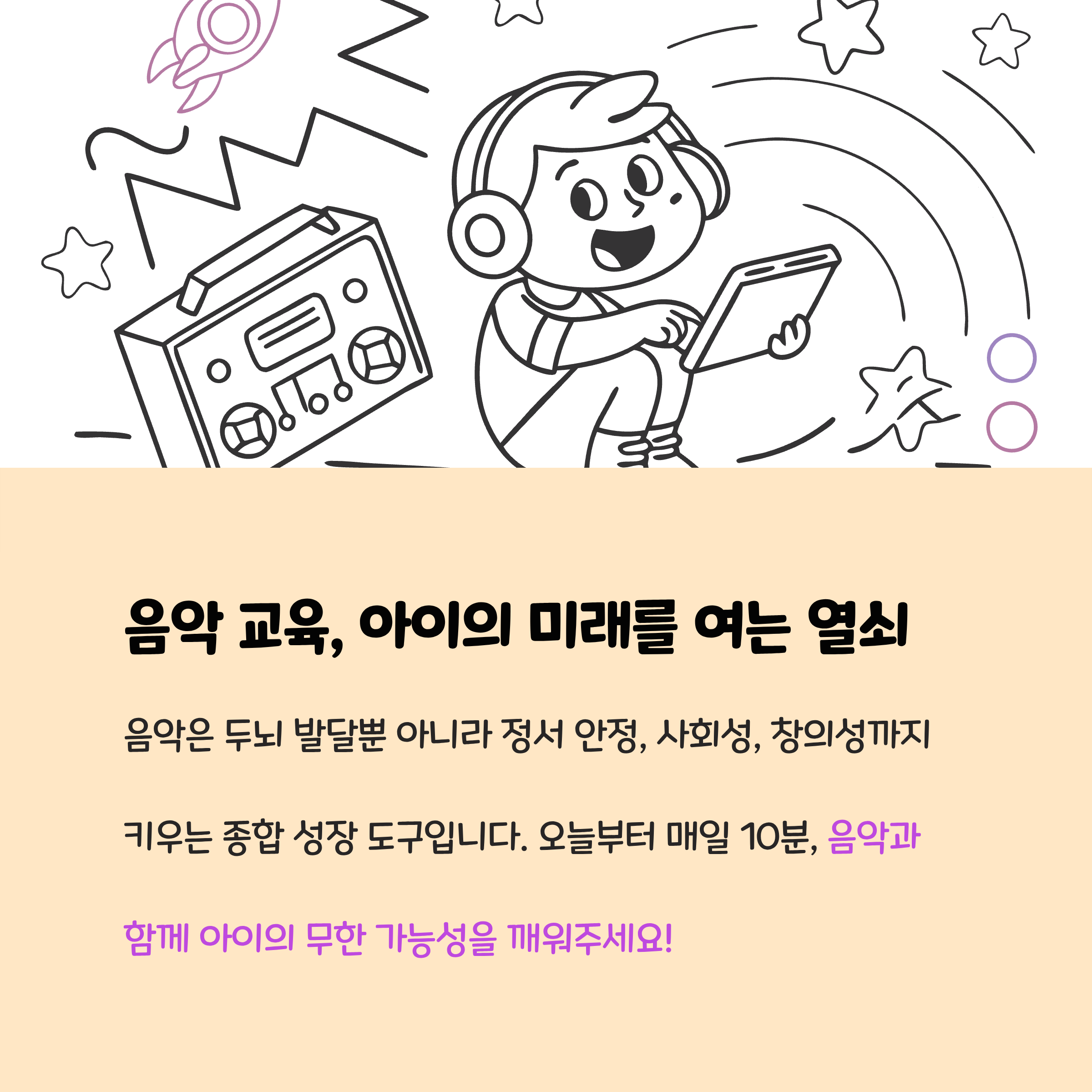 음악 교육은 아이의 뇌 발달에 긍정적 영향을 미칩니다. 리듬, 음정, 소리 구별 능력 향상과 함께 정서, 사회성, 언어 능력 증진에도 도움이 됩니다. 아이의 전인적 성장을 돕는 기반이 됩니다.