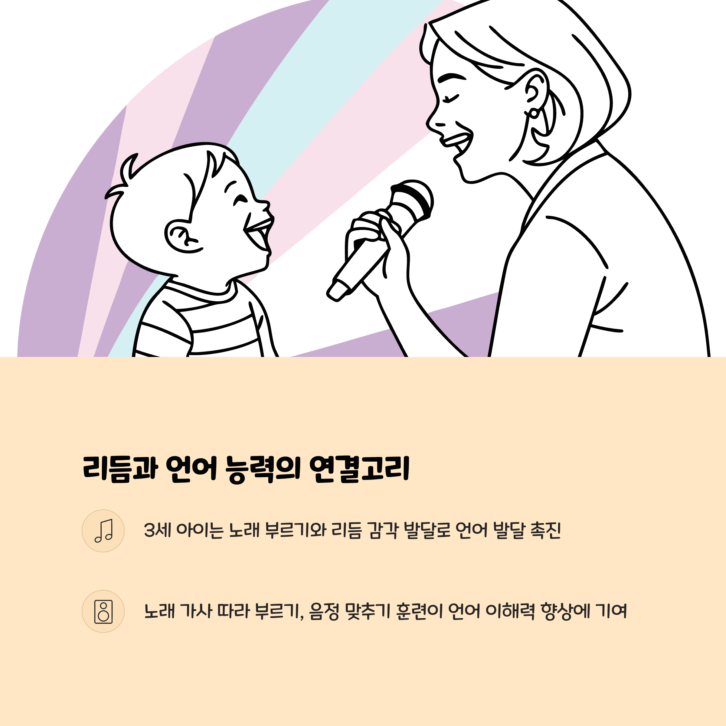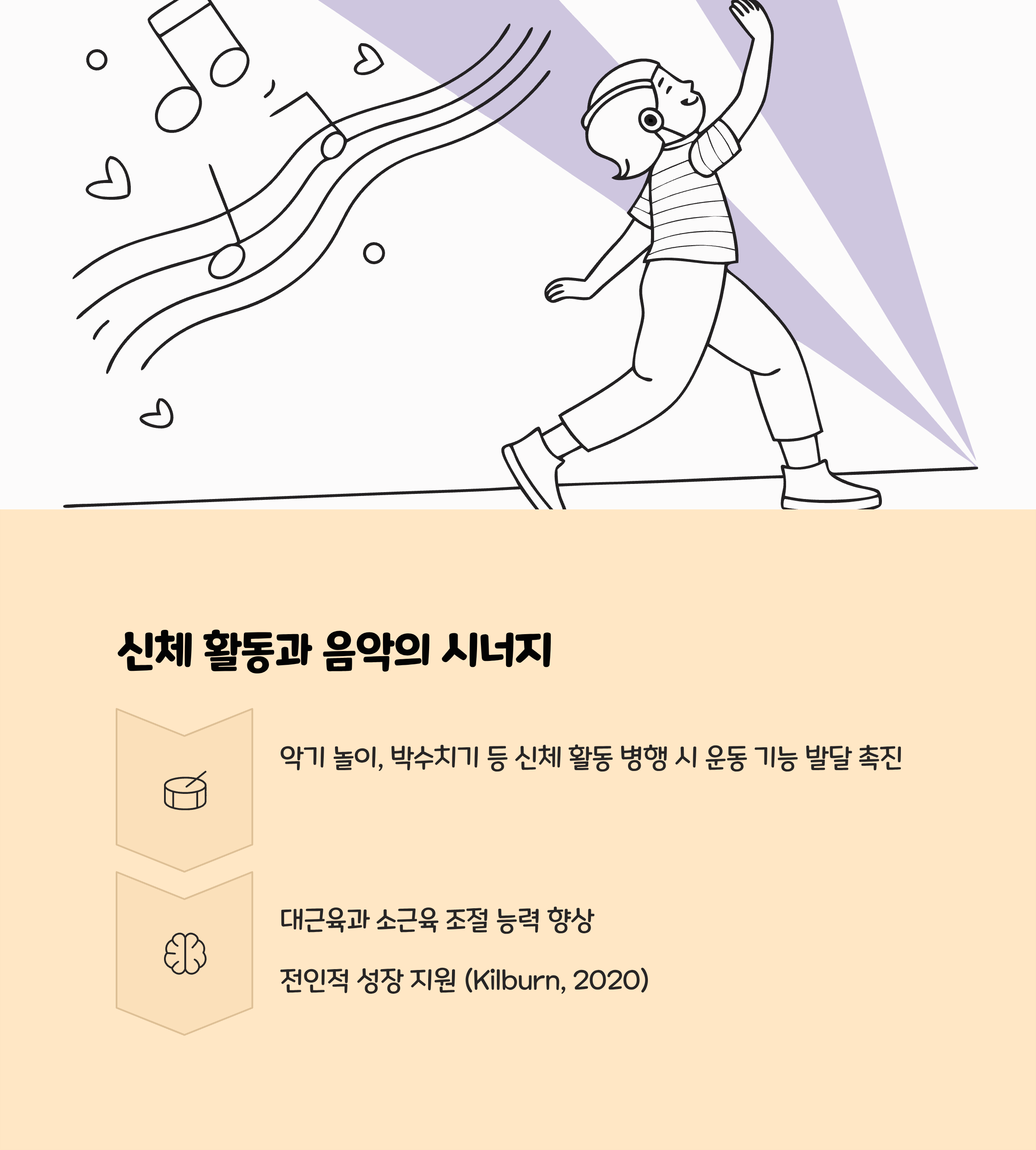 음악은 아이가 자연스럽게 언어와 수학적 패턴을 익히고, 자기표현과 교감 능력을 기르는 중요한 도구입니다. 특히 박자와 리듬에 맞춰 몸을 움직이며 노래하거나 악기를 다루는 활동은 집중력과 자존감을 높이고, 사회적 규칙 준수 및 협동심을 촉진합니다.