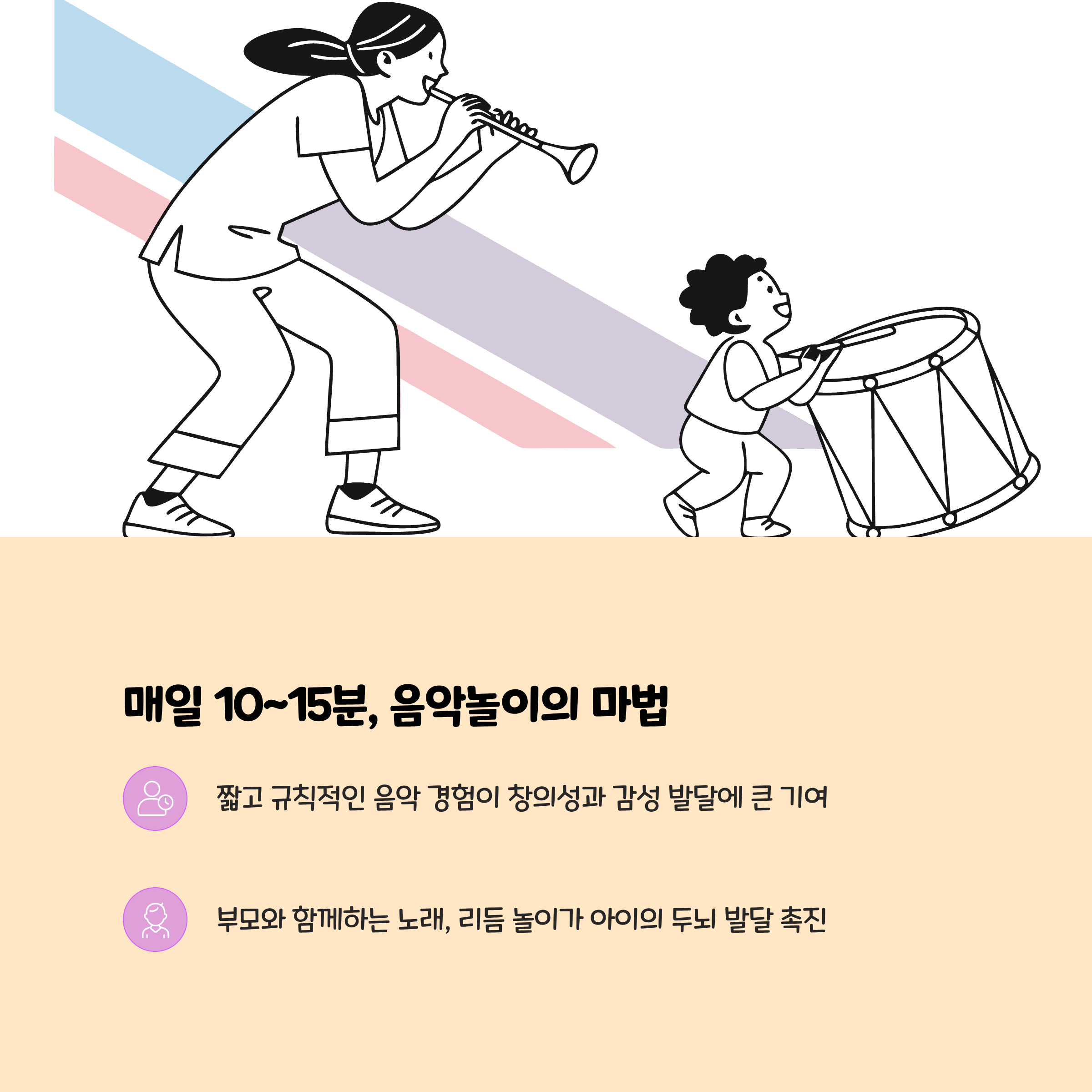 - 매일 10~15분씩 정해진 음악 시간과 자유 음악 놀이 시간을 규칙적으로 가져 아이가 음악을 즐겁게 경험할 수 있게 합니다.