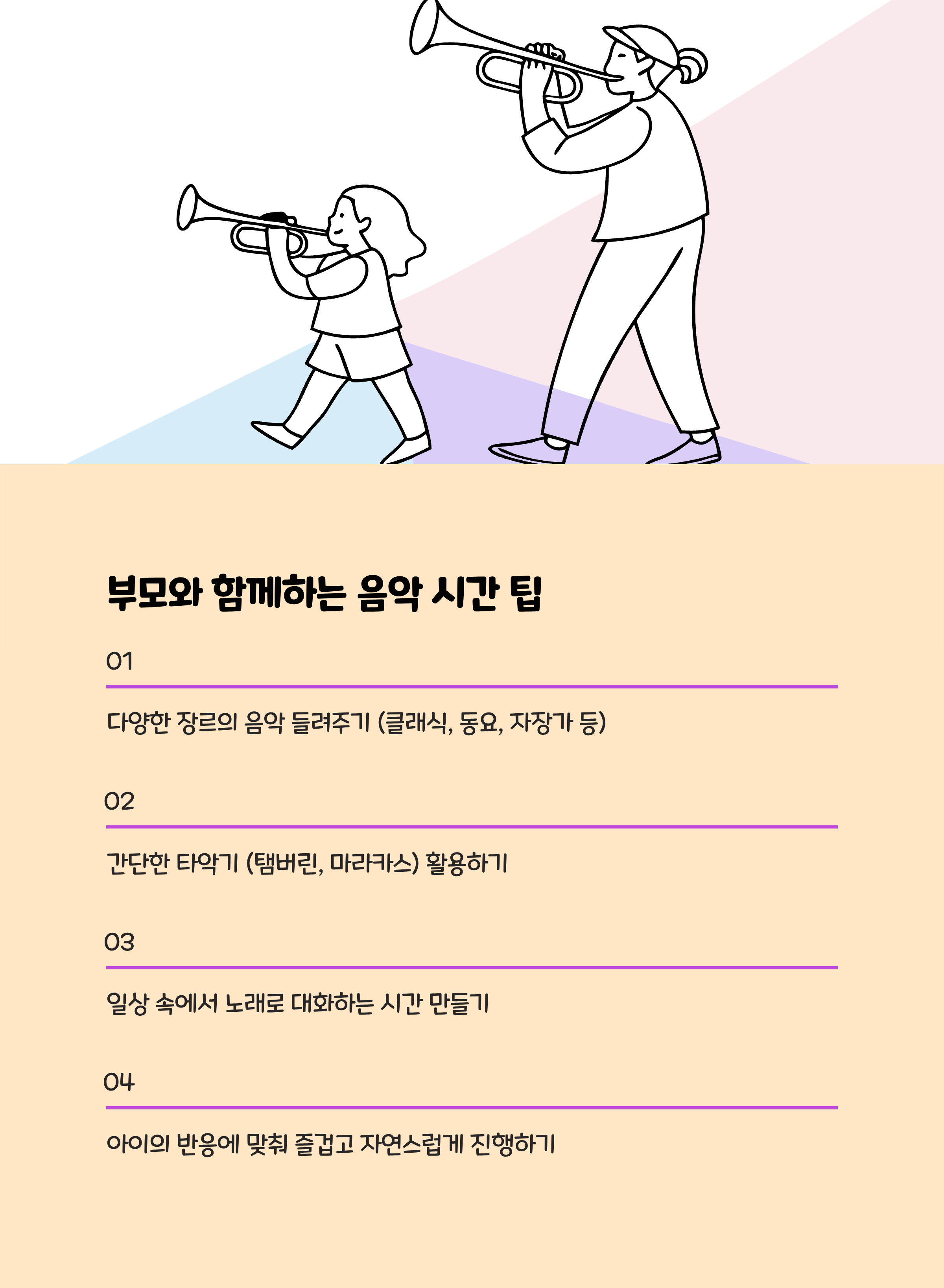 - 매일 10~15분씩 정해진 음악 시간과 자유 음악 놀이 시간을 규칙적으로 가져 아이가 음악을 즐겁게 경험할 수 있게 합니다.