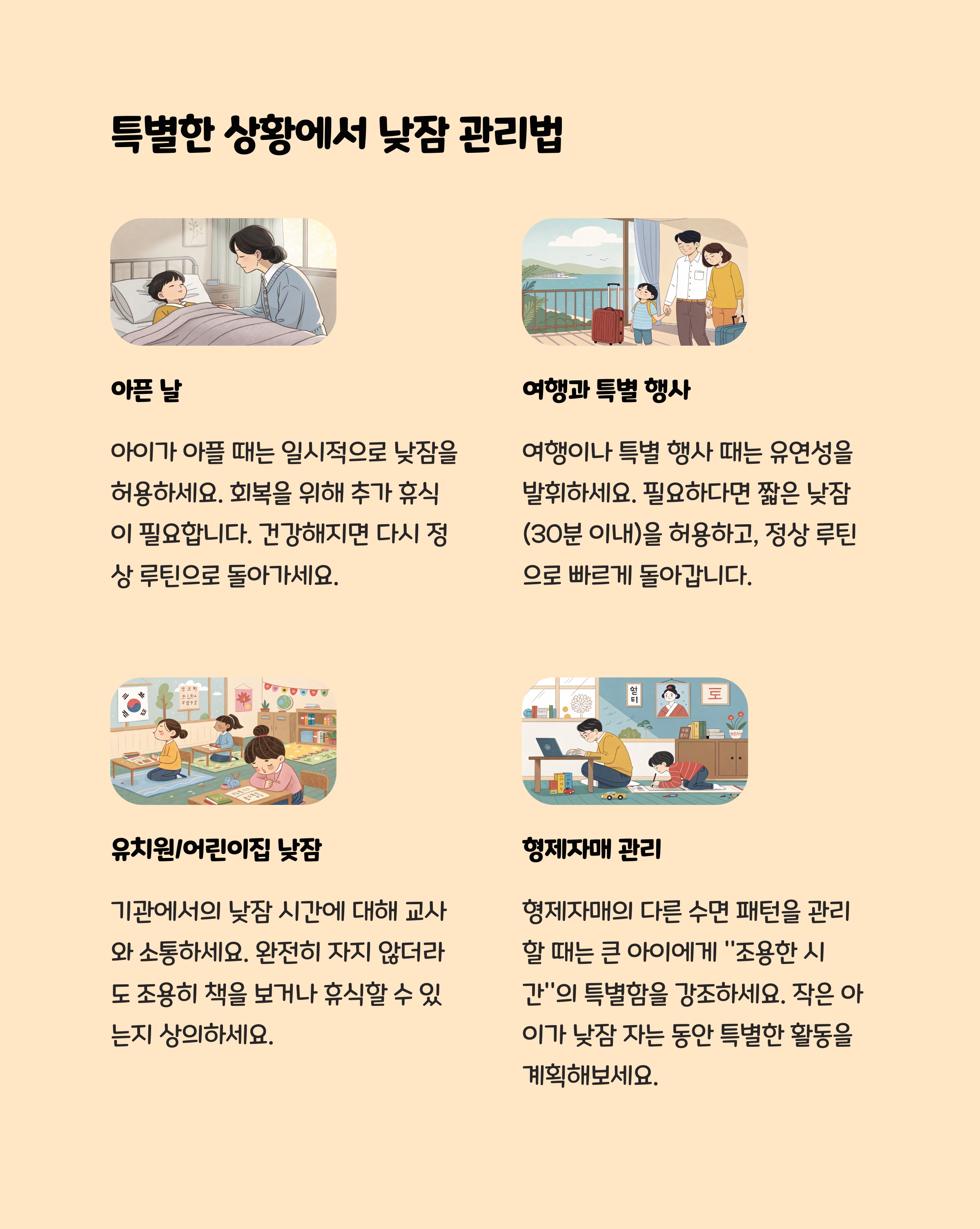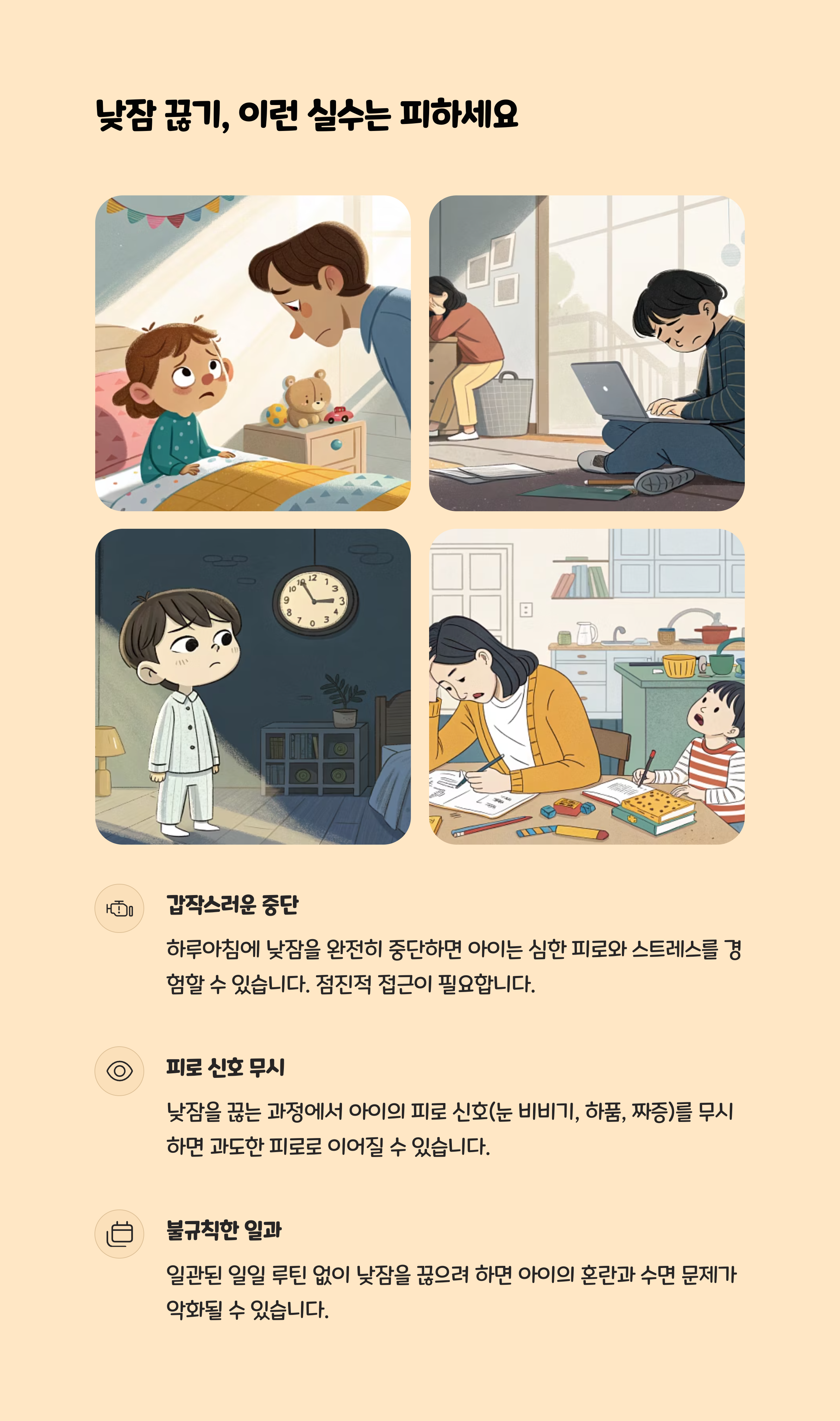 - 아이가 낮잠을 자지 않더라도, ‘쉬는 시간’은 반드시 지키세요. 이 시간은 아이의 신체적·정서적 안정에 매우 중요합니다.