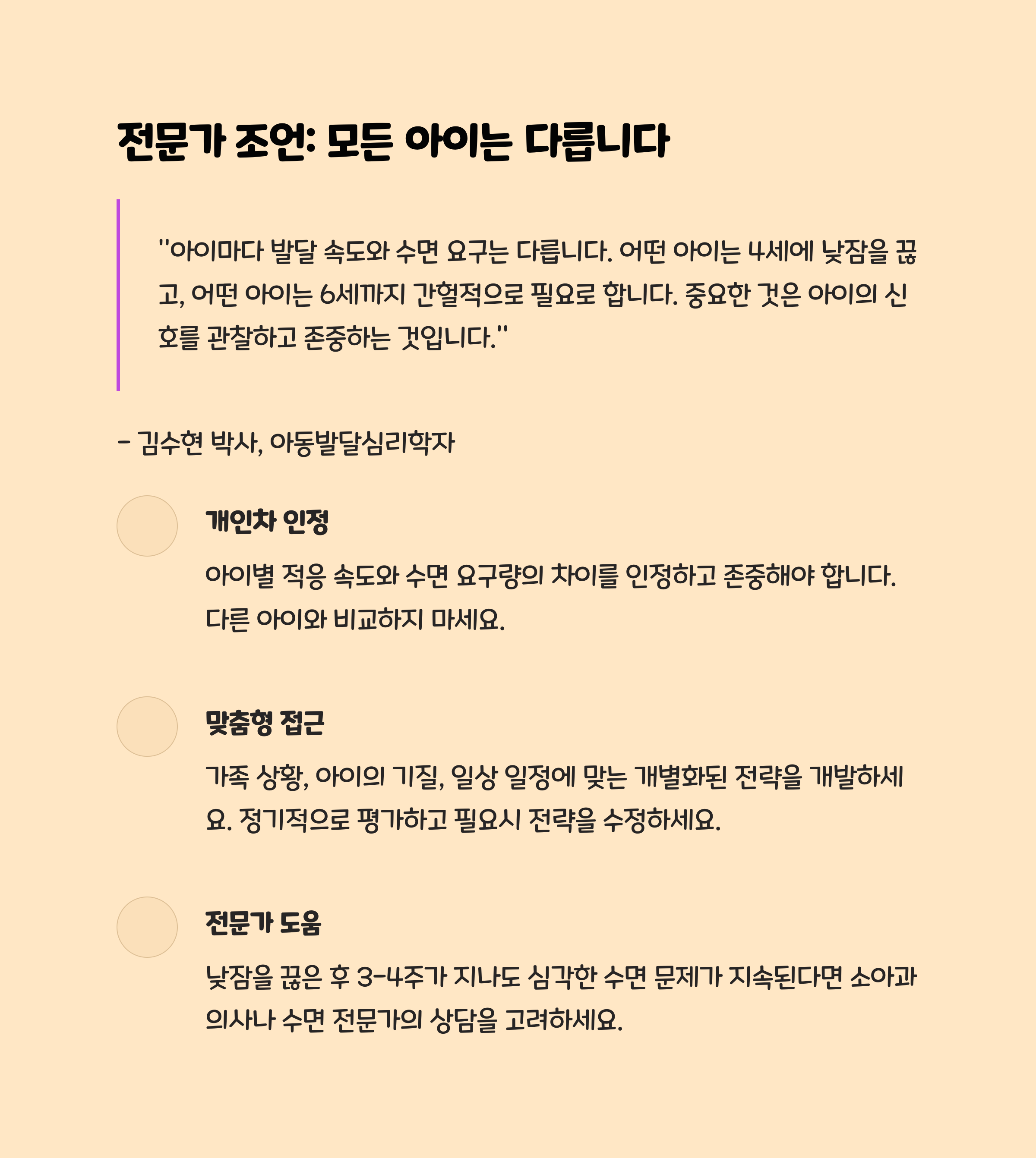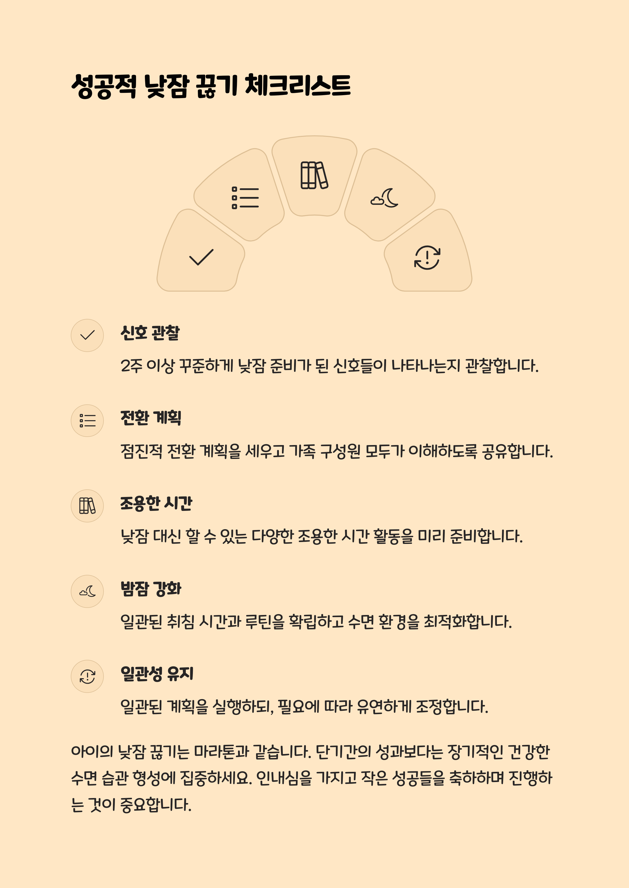 일관성 있는 루틴을 유지하고, 아이의 졸음 신호(하품, 눈 비비기, 집중력 저하 등)를 세심하게 관찰하세요. 아이가 너무 피곤해하면 낮잠을 완전히 끊지 말고, 짧은 휴식 시간을 주는 것이 좋습니다.