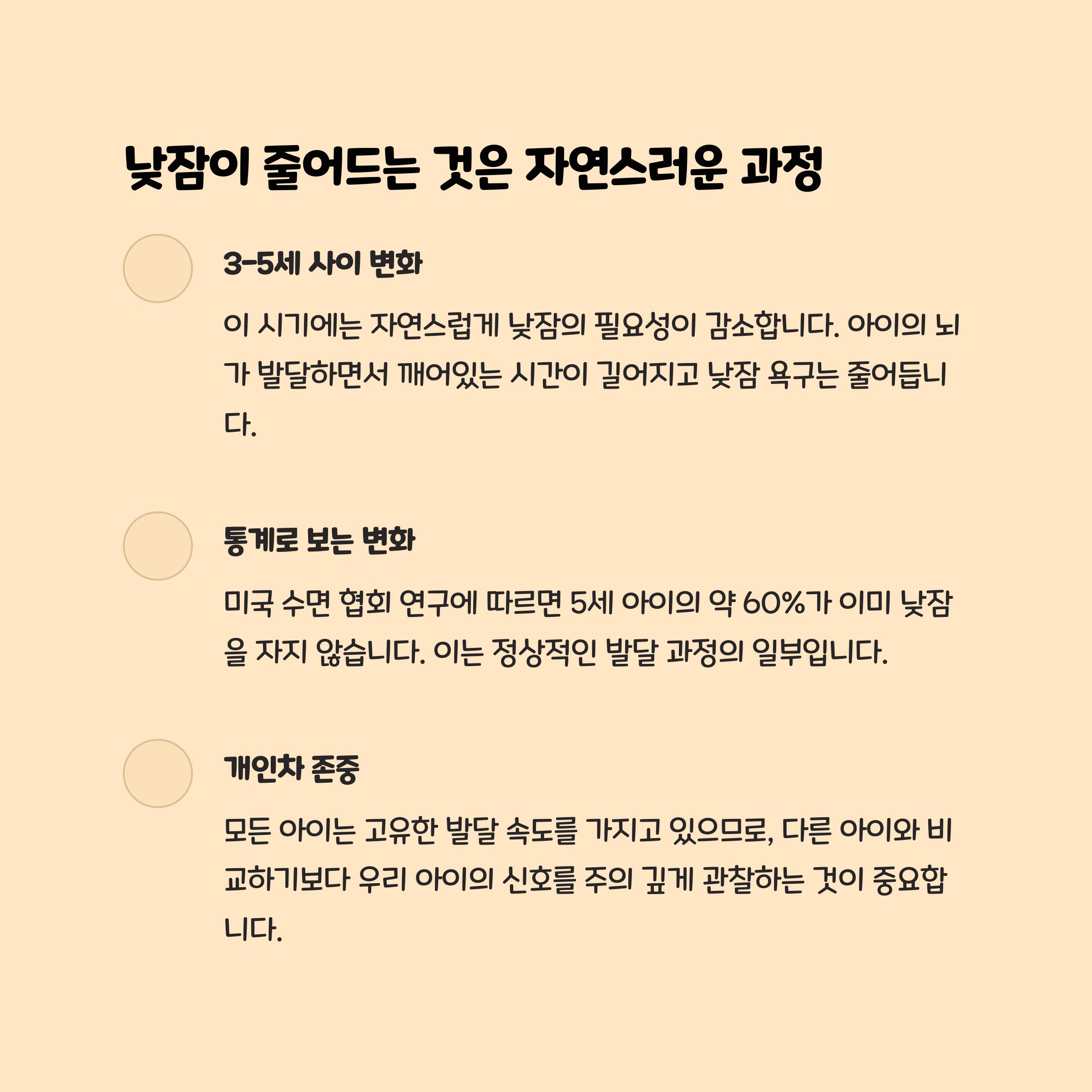 이런 변화가 2주 이상, 일주일에 4~5회 반복된다면 낮잠을 줄일 준비가 된 신호로 볼 수 있습니다.