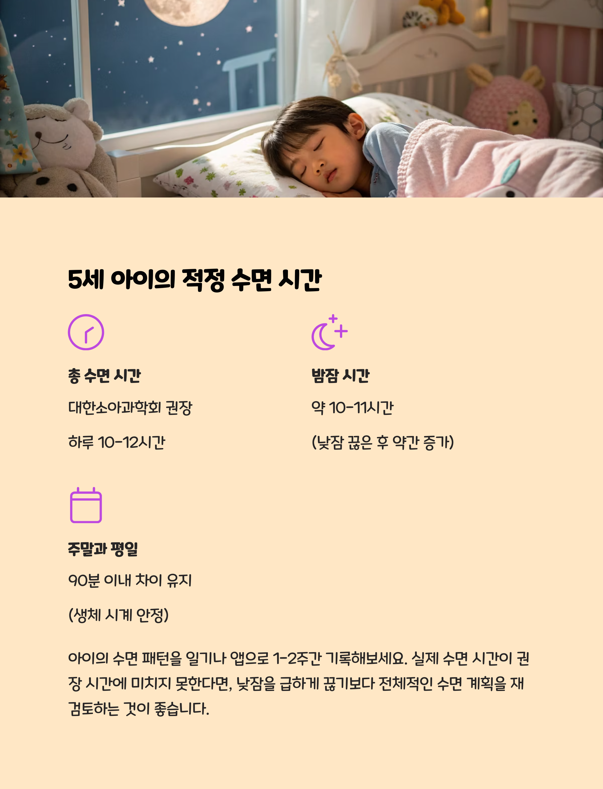 5세는 낮잠을 완전히 끊거나 줄여가는 시기입니다. 미국수면재단(NSF)과 국내 소아과 지침에 따르면, 만 5세 아이의 70% 이상이 낮잠 없이도 충분히 생활할 수 있습니다. 하지만 일부 아이는 여전히 낮잠이 필요할 수 있으니, 아이가 낮잠 없이도 활기차고 밤잠에 문제가 없다면 굳이 재우지 않아도 괜찮습니다.
