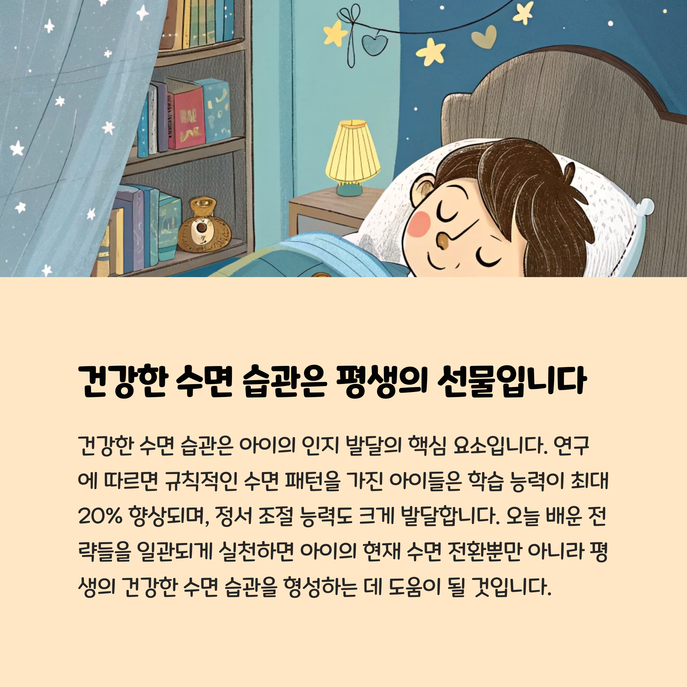 충분한 밤잠(10~12시간), 규칙적인 생활, 균형 잡힌 식사, 오전의 신체 활동, 오후의 조용한 활동이 중요합니다. 부모의 꾸준한 관심과 사랑이 아이의 건강한 수면 습관을 만듭니다.