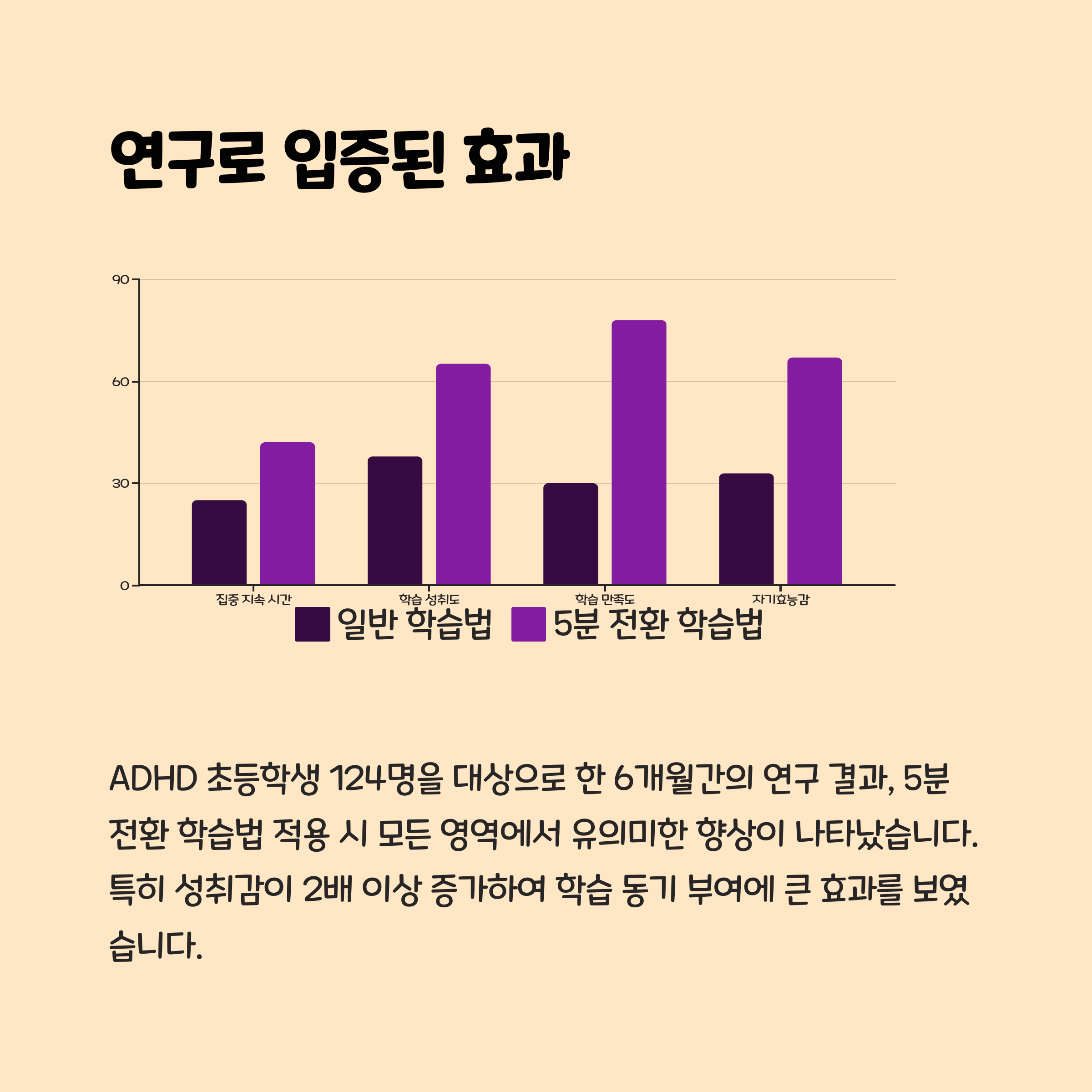 연구와 실제 현장 경험에 따르면, 5분 전환 학습법을 적용한 ADHD 아동은 성취감과 자기 효능감이 높아지고, 학습 효율도 향상됩니다. 짧은 시간 동안 집중해 작은 목표를 달성하는 경험이 반복되면, 학습에 대한 두려움이 줄어들고, 점차 집중 시간도 늘어납니다. 또한, 긍정적인 학습 습관이 형성되고, 자기 조절 능력도 함께 발달합니다. 이 방법은 ADHD 아동뿐 아니라, 집중력이 부족한 모든 아동에게 도움이 되는 효과적인 학습 전략입니다.